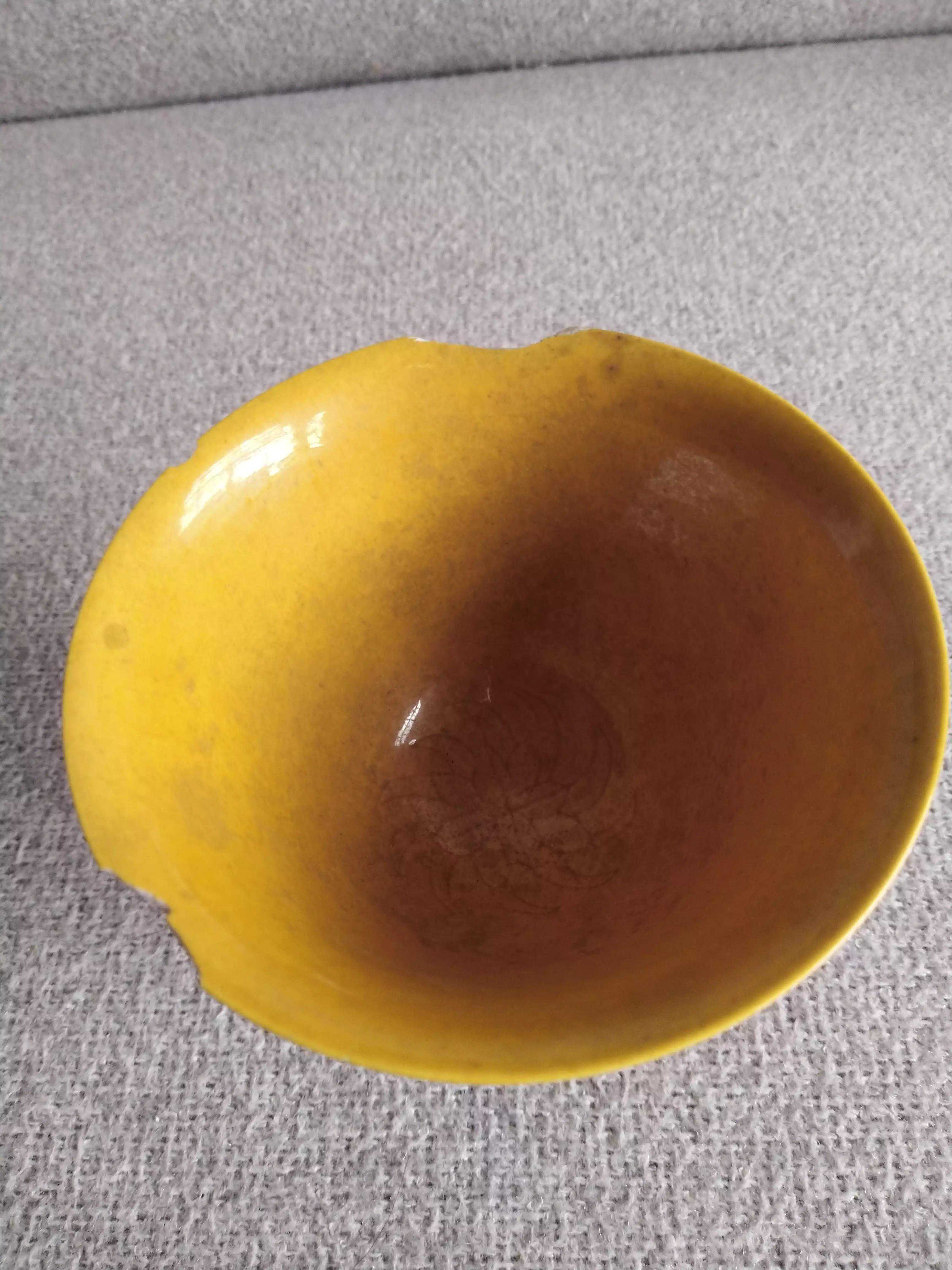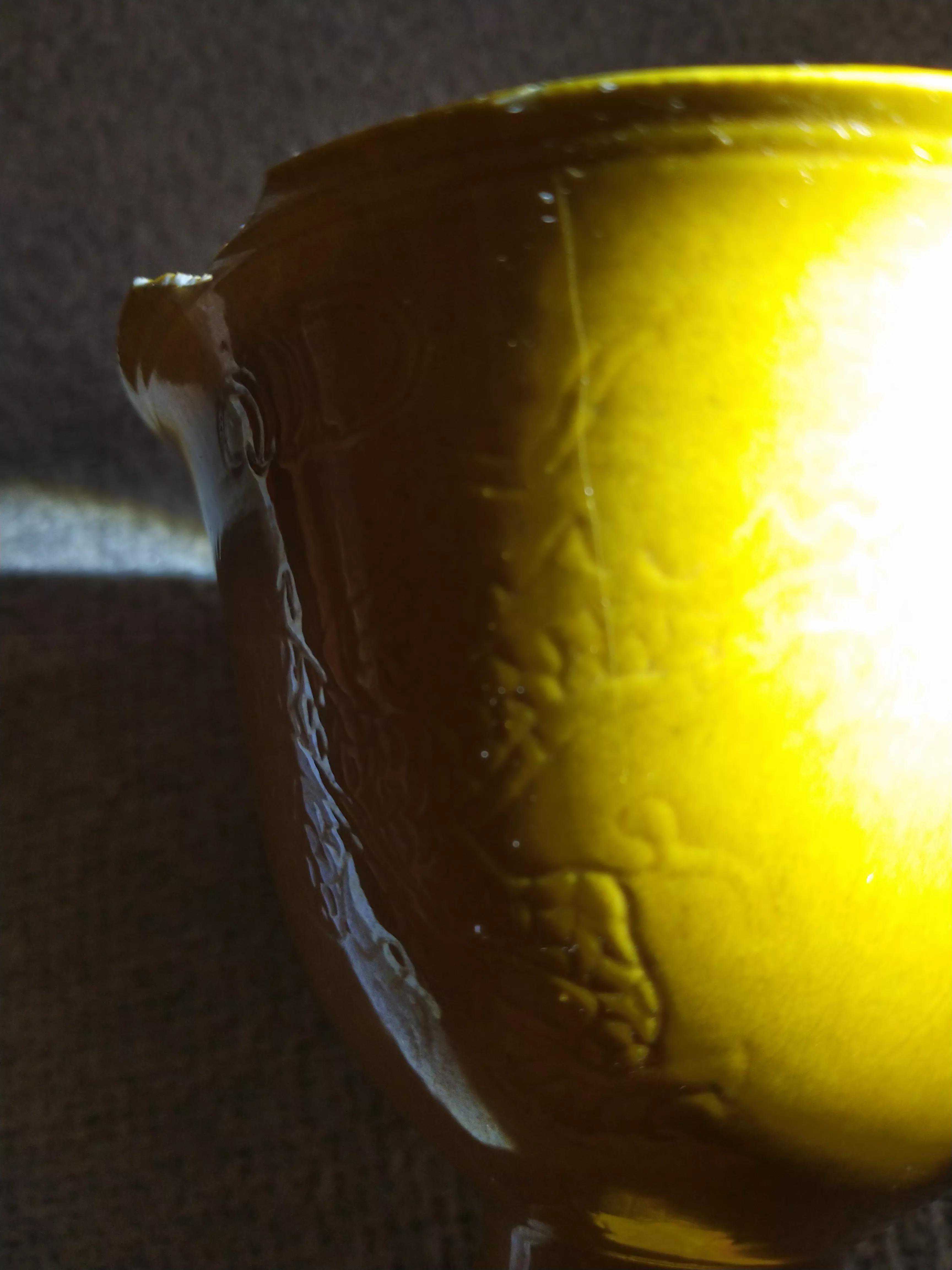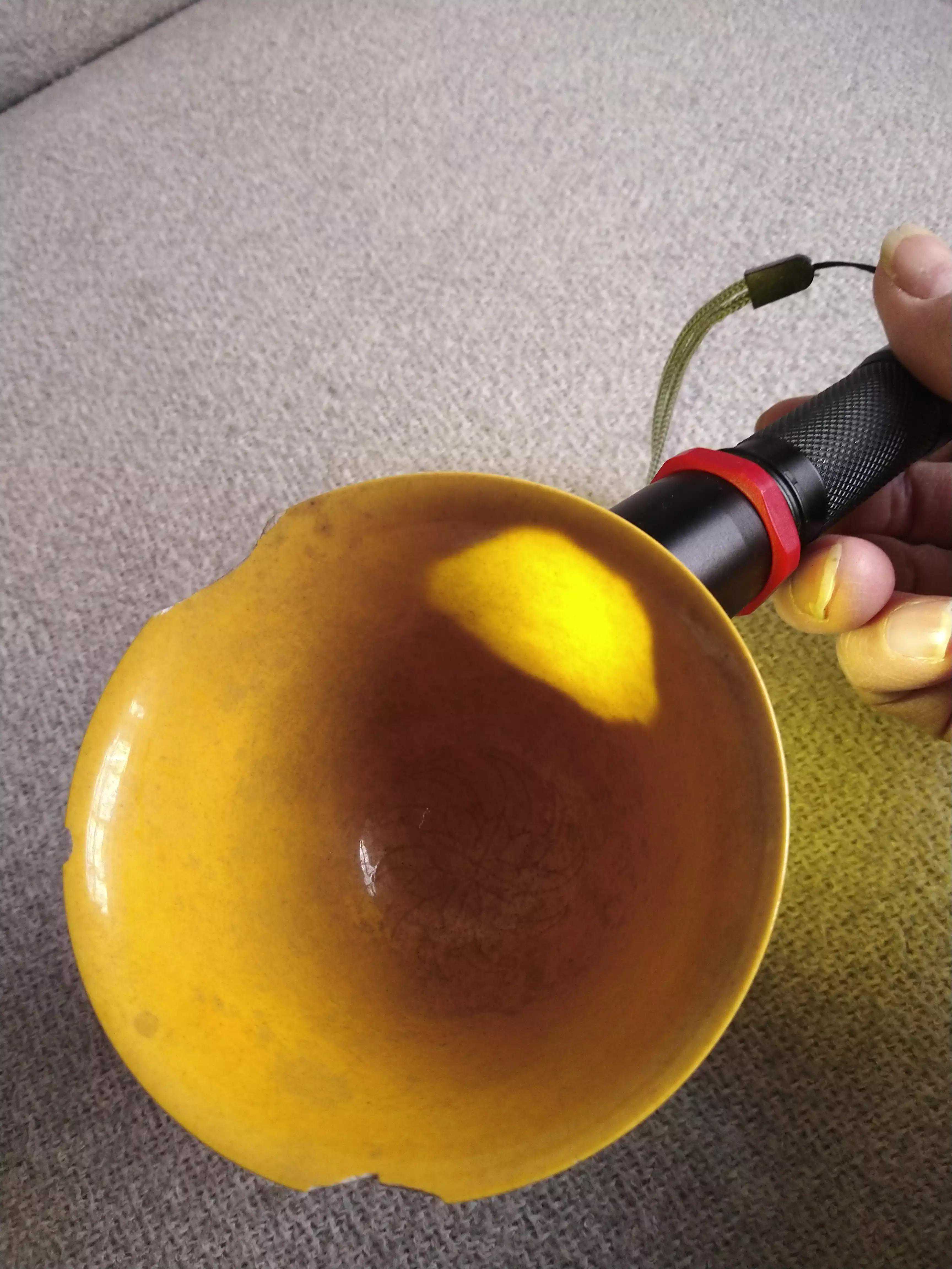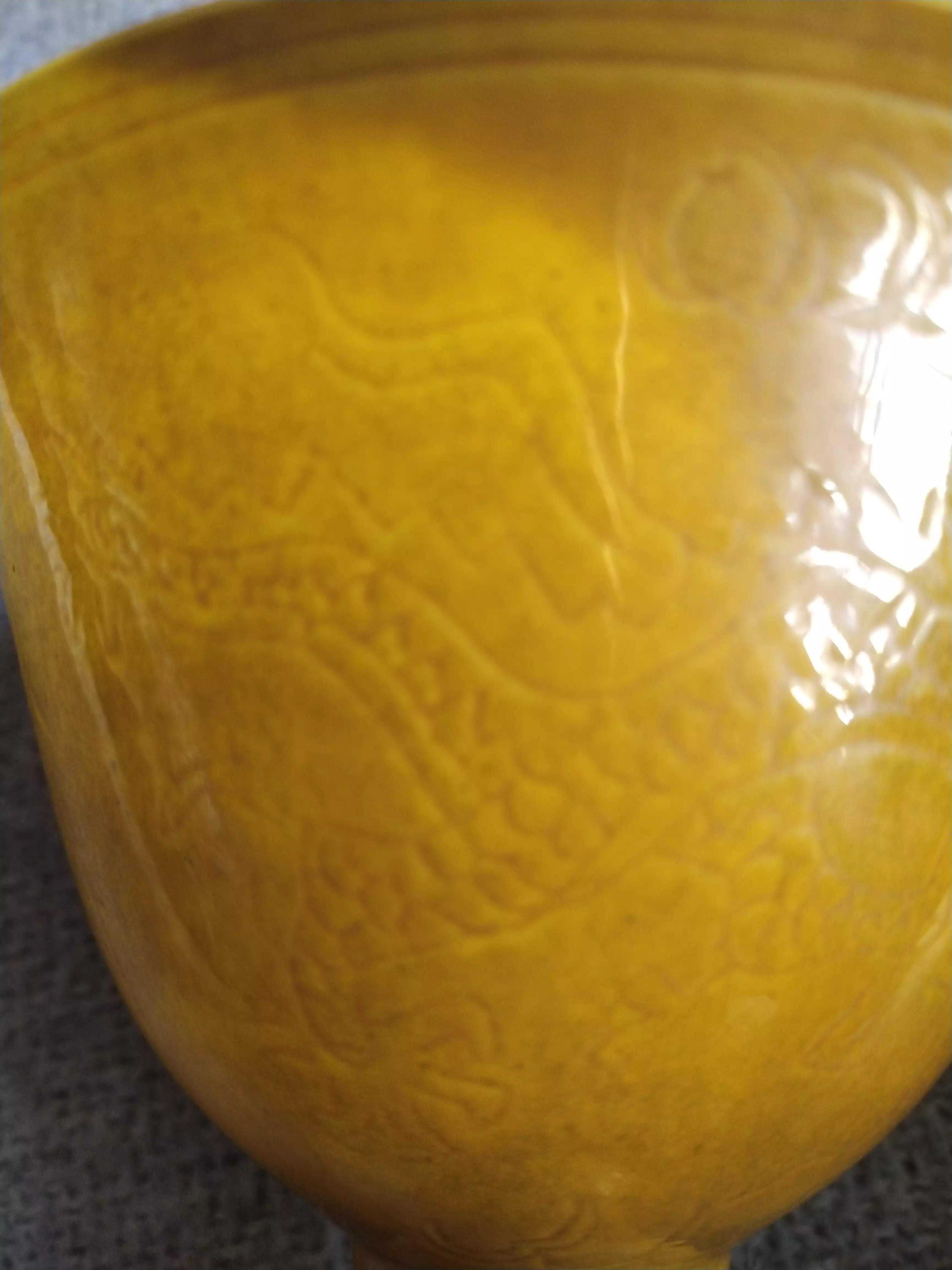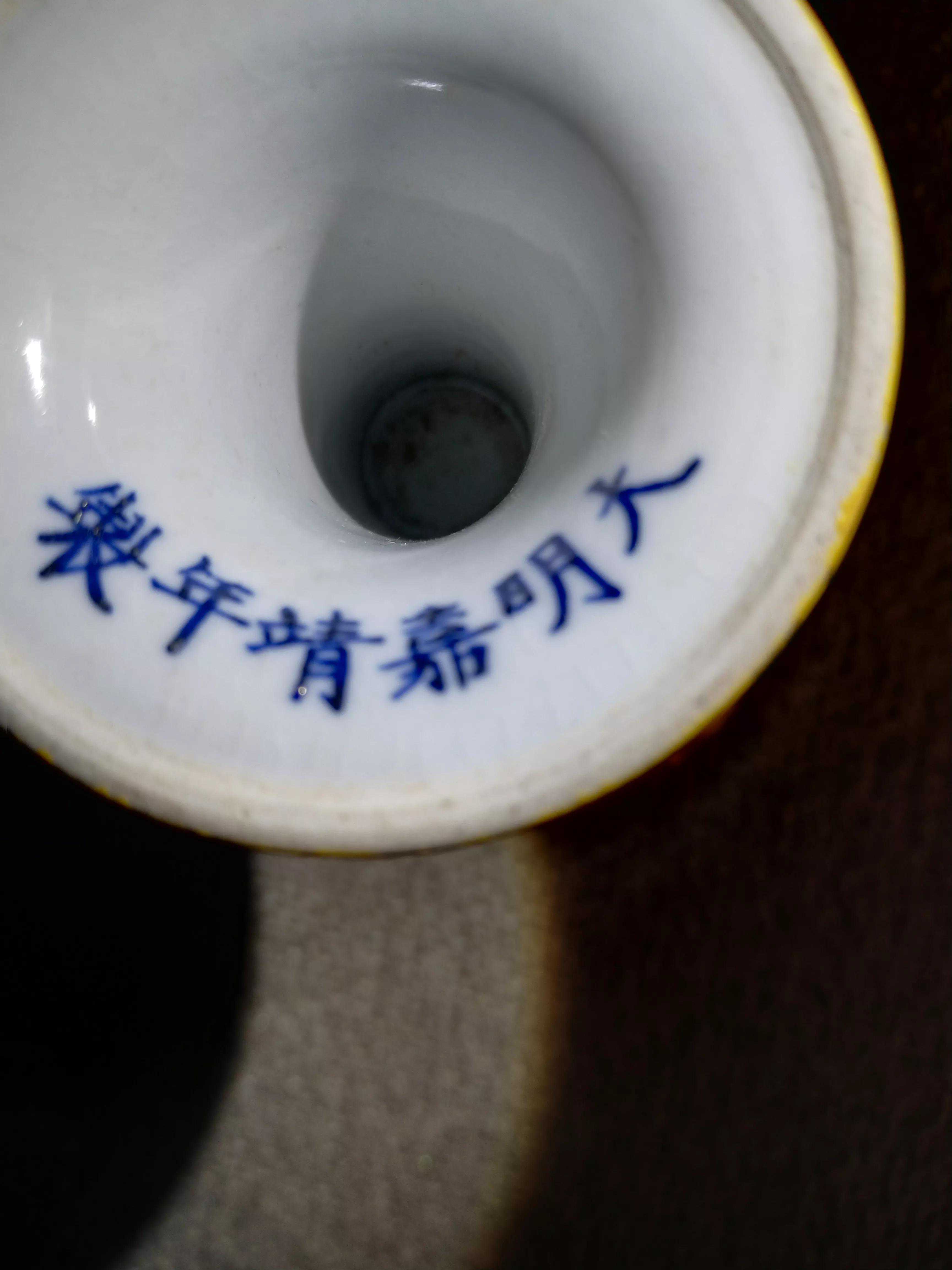 偶得嘉靖黄釉杯,杯外壁暗刻五爪龙纹,暗刻“内府”二字,杯柄暗刻芭蕉纹饰。薄胎黄釉,呈半透明。底款书写规整,白釉亮白。