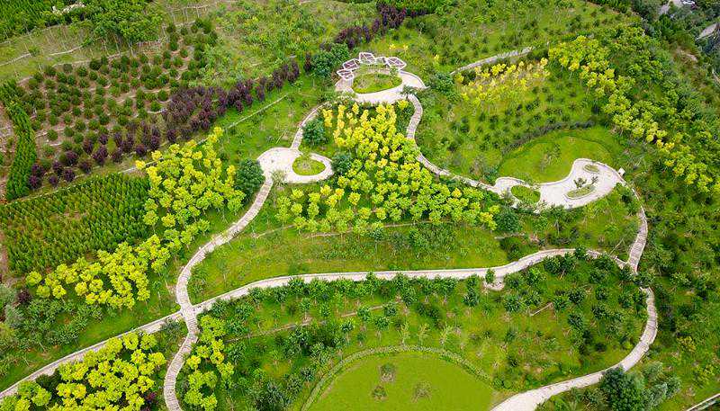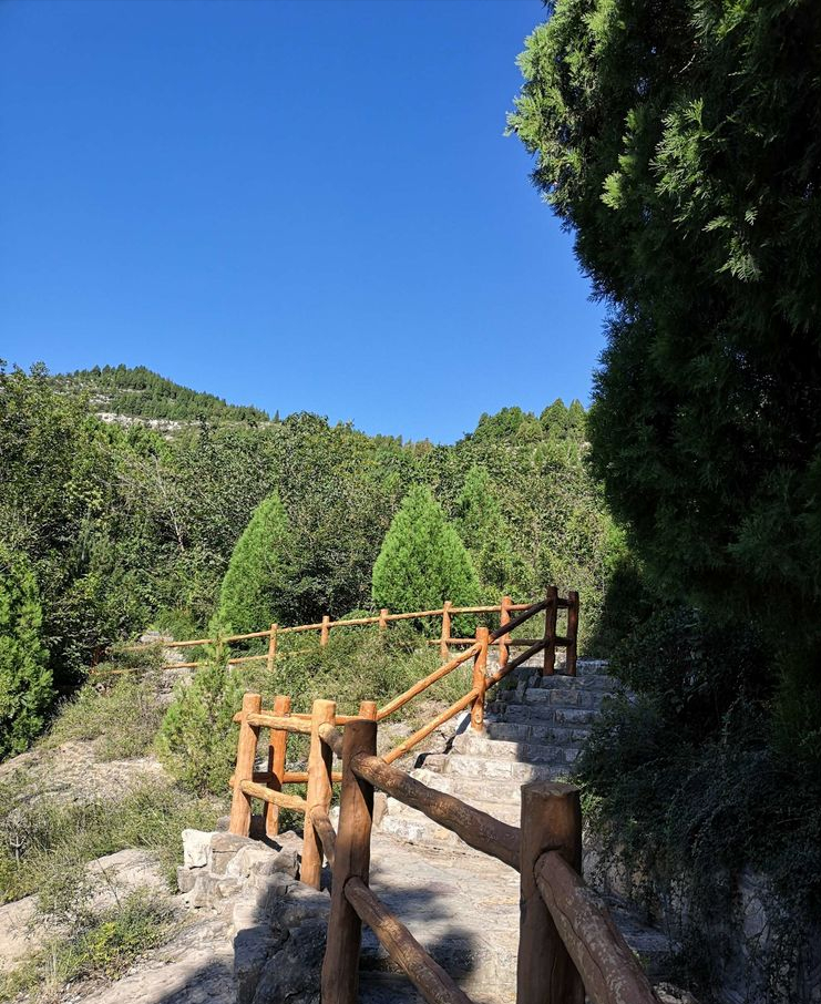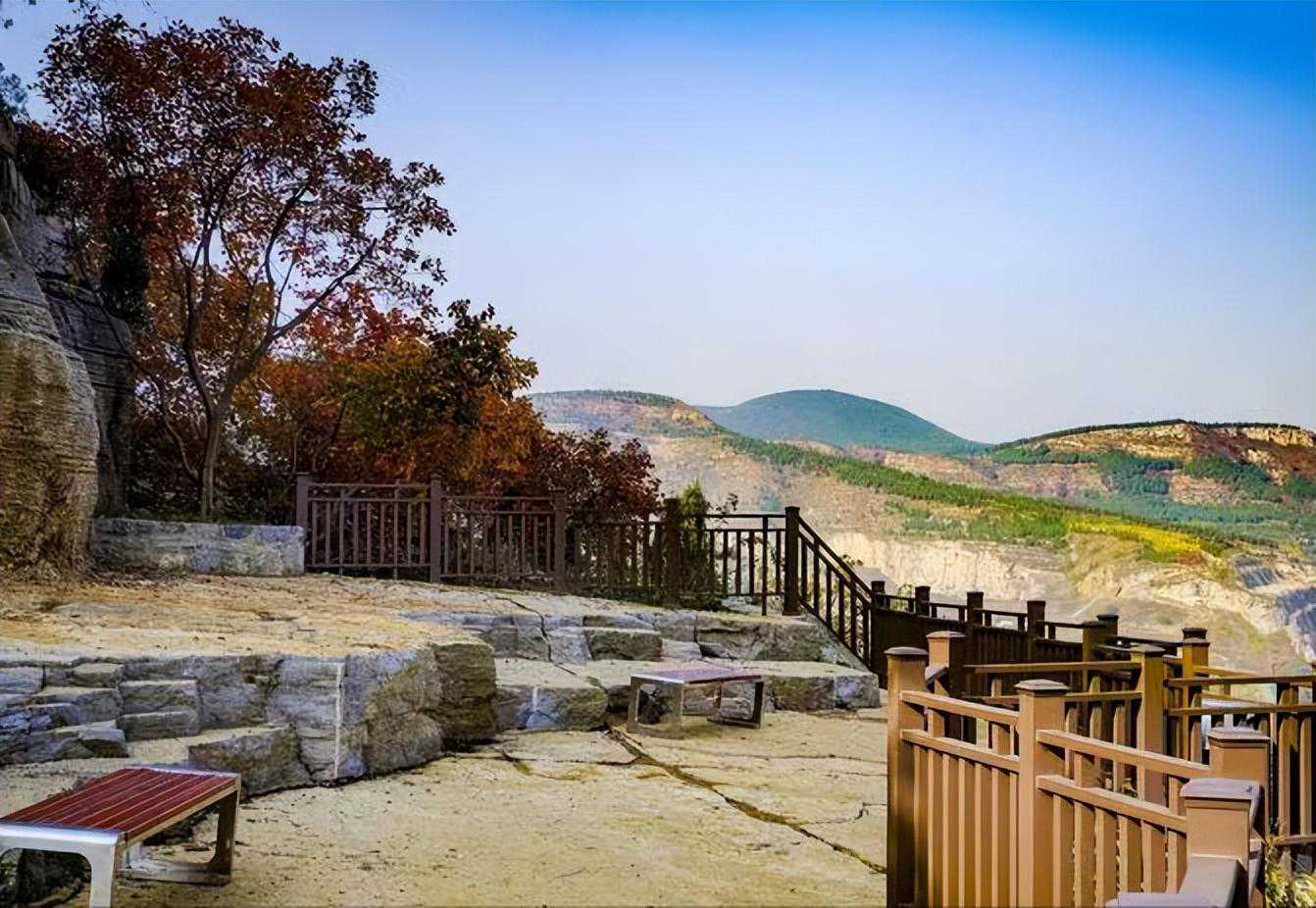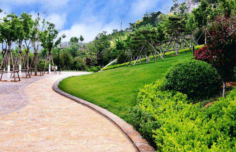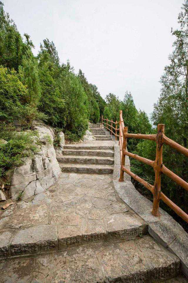 游步道选择自然植被良好、山石分布自然的路线;铺装材料选择糠粱砂、清口石、冰纹石等,道路既风格多样,又与周围环境相协调,生态自然。断崖上设置护栏,利用原有山体平台修建观景平台,满足游客观光需求和猎奇心理。