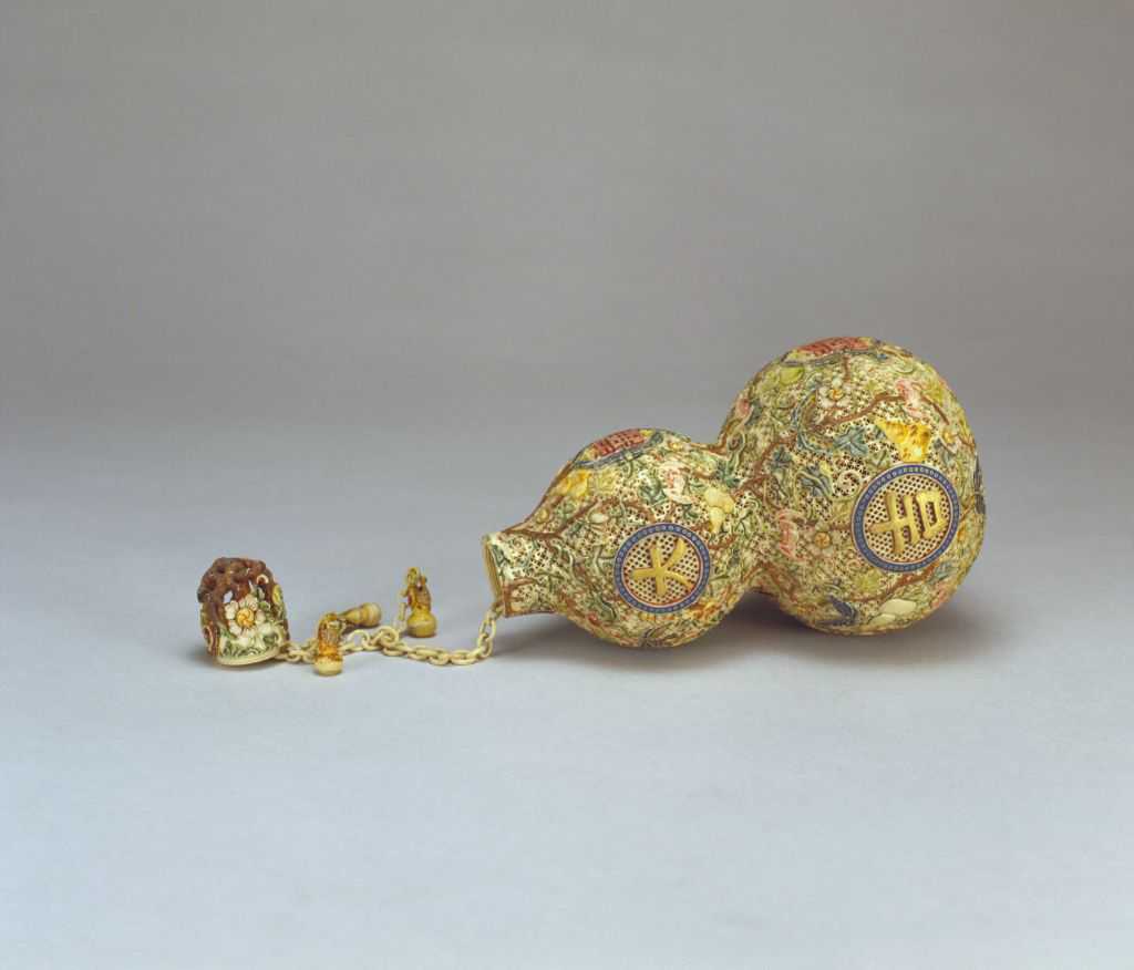 盖钮内有螺旋套口,腹内有活环长链一根,链上下与葫芦盖底相连。长链上又有三条小链,每条小链上分别带有一只小葫芦,雕刻极为精细。这种不通过任何拼接手段,纯以镂雕为主制作复杂的活链结构的工艺,是清代象牙雕刻的突出成就。根据当时各地不同的风格特征及牙作的构成情况,这件象牙葫芦虽然没有留下款识,但应是出自广东籍匠人之手。