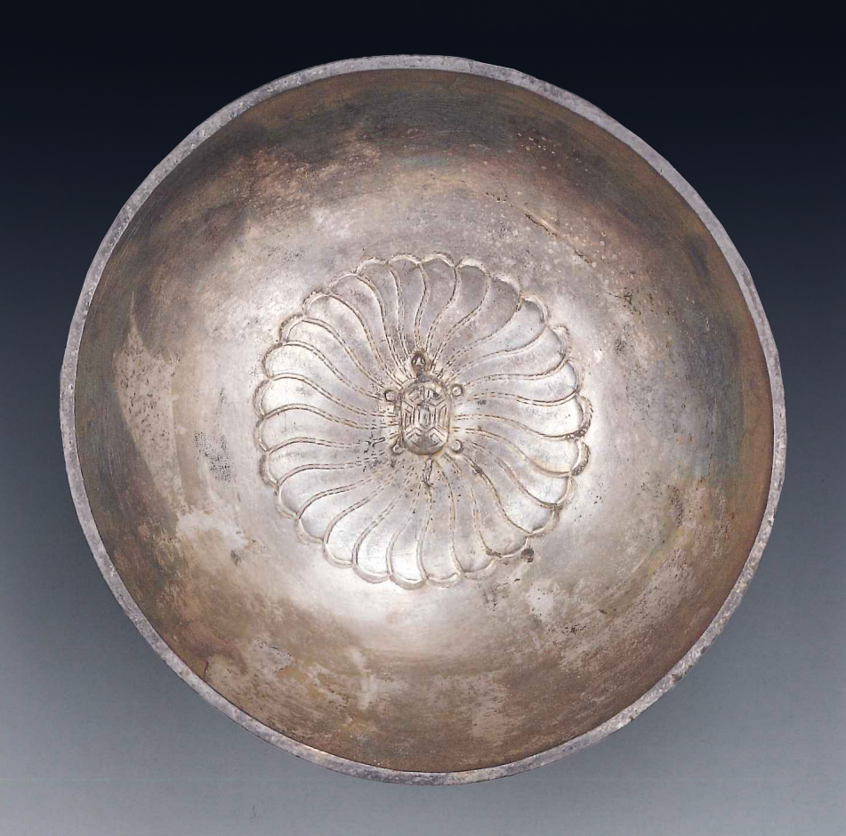 荷叶龟纹杯在西大街窖藏发现了十件。此杯特别之处在于杯底錾刻二十六曲荷叶一张,荷叶上趴了只小乌龟。斟上美酒,荷叶似有水波荡漾,龟仿若水中游。《史记·龟策列传》有载:“龟千岁乃游于莲叶之上,蓍百茎共一根,又其所生,兽无虎狼,草无毒螯,江旁家人常蓄龟饮食之,以为能导引致气,有益于助衰养老。”宋人诗词中常写到此杯,此杯也常用来祝寿。