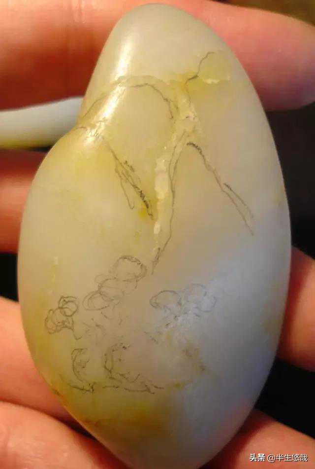 这是一块绺裂比较多的籽料,挂淡淡的黄皮,质不错,但必须施以雕工才可体现其拥有的价值。如若顺裂切开,就会细碎的不值一钱;如果将绺裂尽数挖去,又会破坏完整的料形。办法只有一个:"借"!借裂为纹,挖脏遮绺。顺便说一句:为重现整个过程,我将已画完的墨迹去除重来了一次当然,首先是铅笔草稿