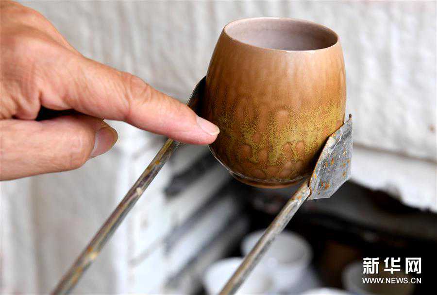 在河南省巩义市站街镇小黄冶村的工作室里,游光明在查看他烧制的“三彩雕花杯”(6月19日摄)。新华社记者李安摄
