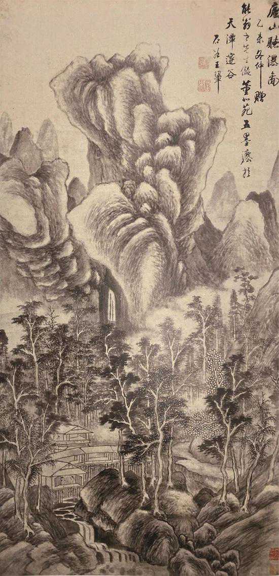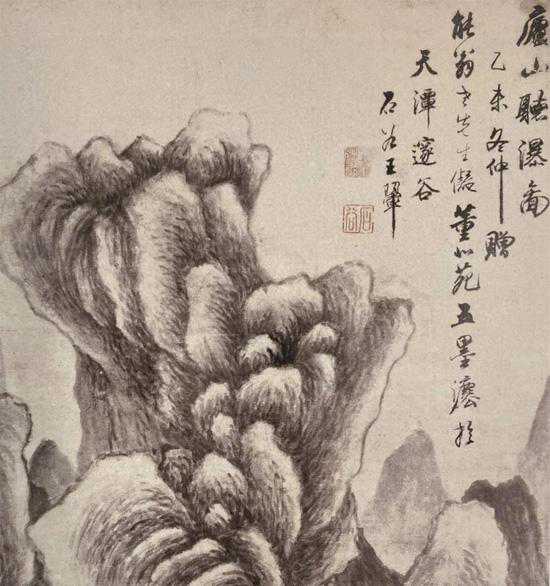 我曾在一次会议上对两张王翚的画作提出了疑问。王翚30岁以前的作品登载在教科书上的只有两件,第一件是《庐山听瀑图》。首先,这幅画的落款明显是写在一层胶矾上面的,说明题款前这幅画被修复过,而一般修画要在作品创作完成后的几十年之后进行,如果数十年之后再题款,作者一般落款会写当时的干支年号,为何这幅作品却写了多年前创作时的年款呢?其次,每个人写款都有一个基本习惯,但在王翚的所有作品中,只有这一张画的落款写法特殊,不像他的其他作品题款那样每行文字下边保持齐平。这幅画的题款结构为“中”字形,中间的一竖行文字直插下来,非常突兀,破坏了整个画面的空间感。通常一个人的题款在一段时期内会有相对固定的书写习惯,同时期的多件作品会使用同一种写法,然而为什么王翚的一生中只有这一张作品的题款是这样写的呢?第三,一般绘画和题款都会使用同一种墨或同一类墨,否则会破坏整幅作品的统一感,而这件作品的题款用墨和作画用墨是不一样的,这也是在王翚作品难得一见的情况,作者为什么会用不同的墨作画和题款呢?