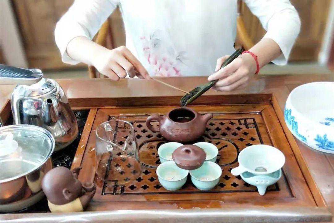 净手即洗手,喝茶卫生很重要,先引茶人荷,请来宾赏茶。品茶讲究用宜兴的紫砂壶为上,这都是为了喝茶前有个放松心情的准备。