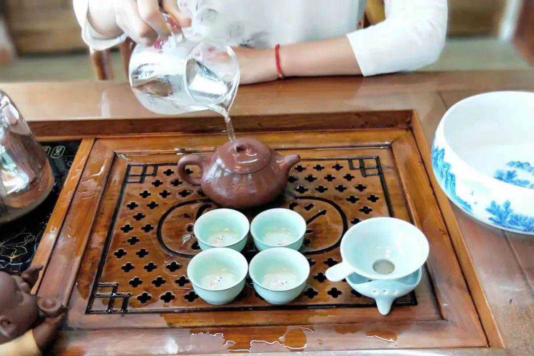 就是把茶叶器具都用开水冲洗一次,目的也是为了卫生清洁,同时给茶具预热,这样出来的茶的味道更香,将沸水倾入紫砂壶、公道杯、闻香杯、品茗杯中,也有朋友说这叫洁具提温。