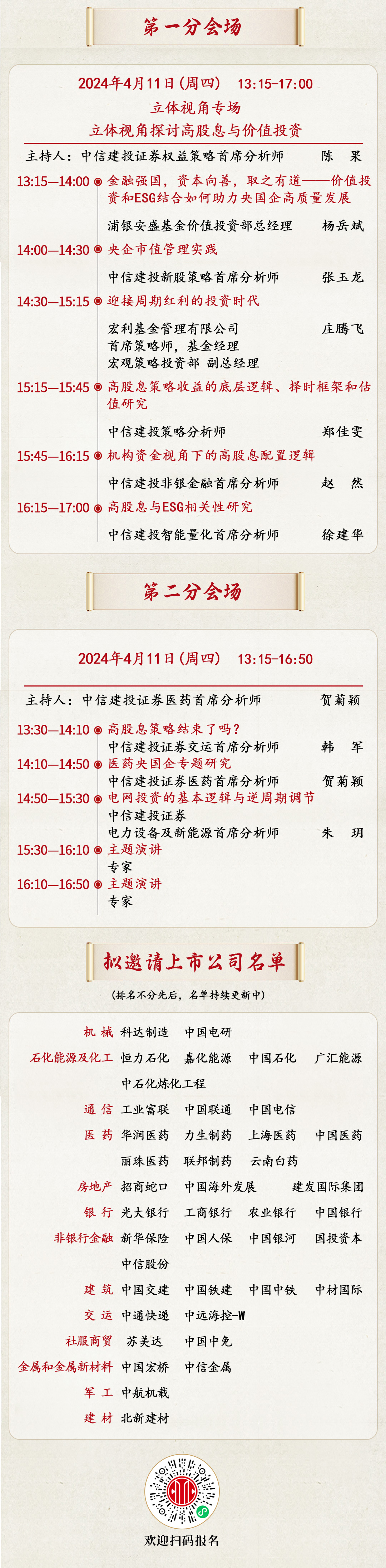本次策略会设置1个主会场+2个分会场,我们邀请重点优质的50余家龙头上市公司和“链长”,共聚一堂,深度解读高股息与市值管理投资逻辑,拥抱投资机会。
