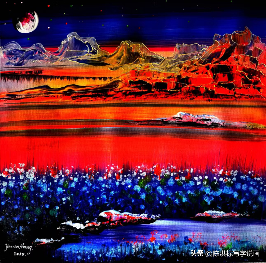 ▲黄建南油画作品《梦境玉湖》。