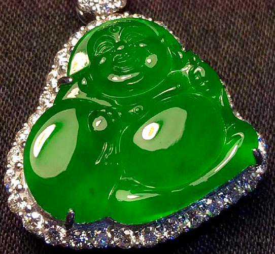我们平时看到的很多翡翠的色,包括满绿,帝王绿的色就是类似,即便一眼看去绿油油的时候却仍旧是色水分离的色,就如上图里的绿佛公,够绿了吧,但是它的色看上去就像是一层薄冰覆盖在上面,并没有跟整个佛公的种水融合。所以,它没有达到色水相融的程度。