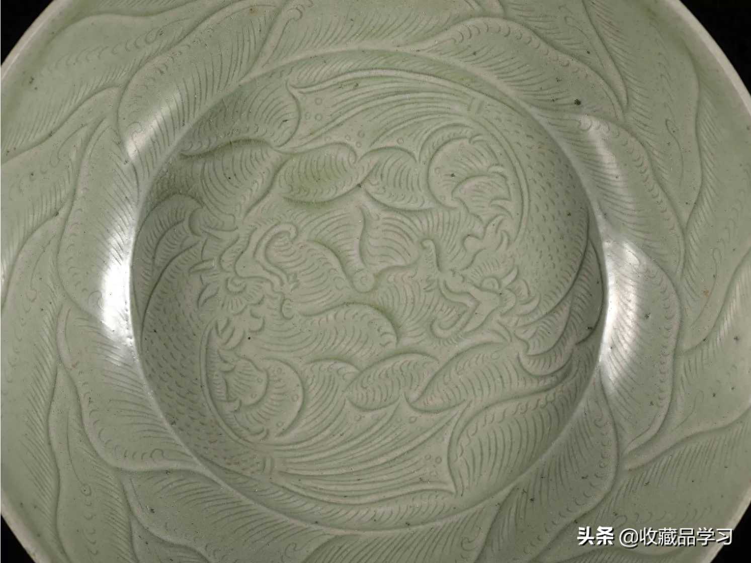 五代—宋越窑青釉刻水波摩羯莲瓣纹钵式碗此碗造型、釉色、工艺俱佳。双面雕刻纹饰,等级高。刀工熟练洒脱,纹饰细致流畅。通体施翠青釉,釉色色青翠,不负越窑秘色瓷“九秋风露越窑开,夺得干峰翠色来”之美誉。