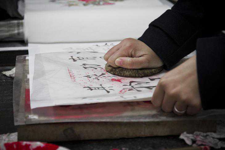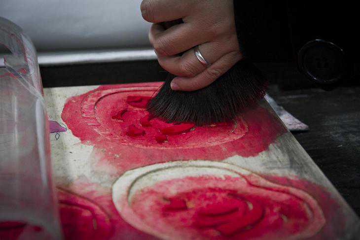 套色工艺是桃花坞年画有别于其它年画的独特工艺。从刻板上印刷出来的年画是单一的黑色的,“就好比素颜的美女,而填套就好比给素颜美女上妆的过程”,给我们展示套印工艺的,是80后年画工艺师乔兰蓉。