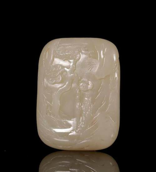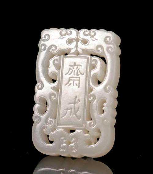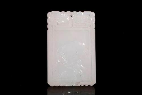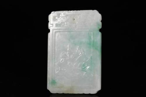 翡翠牌饰,方形,一面雕刻二人对桌而坐,秉烛夜谈,一面雕刻诗文“何当共剪西窗烛,却话巴山夜雨时”,图文相映。
