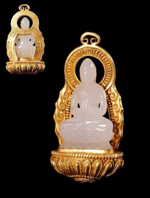 玉雕佛像,双手合十,端坐金质莲台上,身后有背光,并錾刻六字梵文。