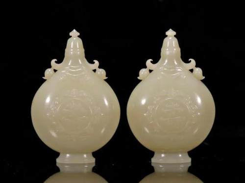 玉瓶双耳,圈足带盖,鼓腹。器身雕刻双龙纹,身躯蜿蜒,鳞甲清晰,做工精巧,生动形象。