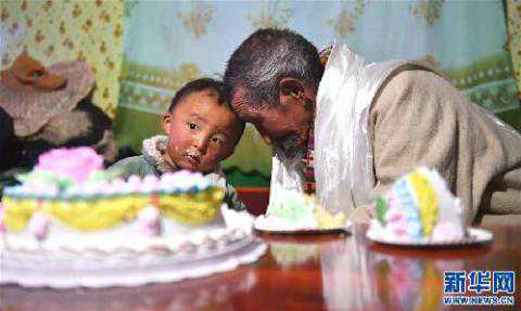 巴珠老人在生日聚会上和自己的曾孙碰额头,以示祝福(3月20日摄)。新华社记者晋美多吉摄