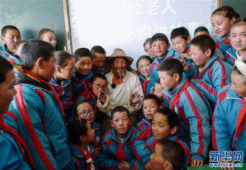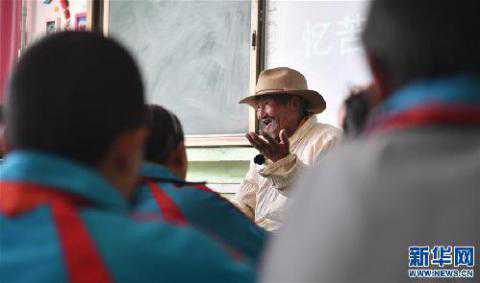 巴珠老人在堆龙德庆区德庆乡中心小学与学生交流(3月20日摄)。新华社记者普布扎西摄