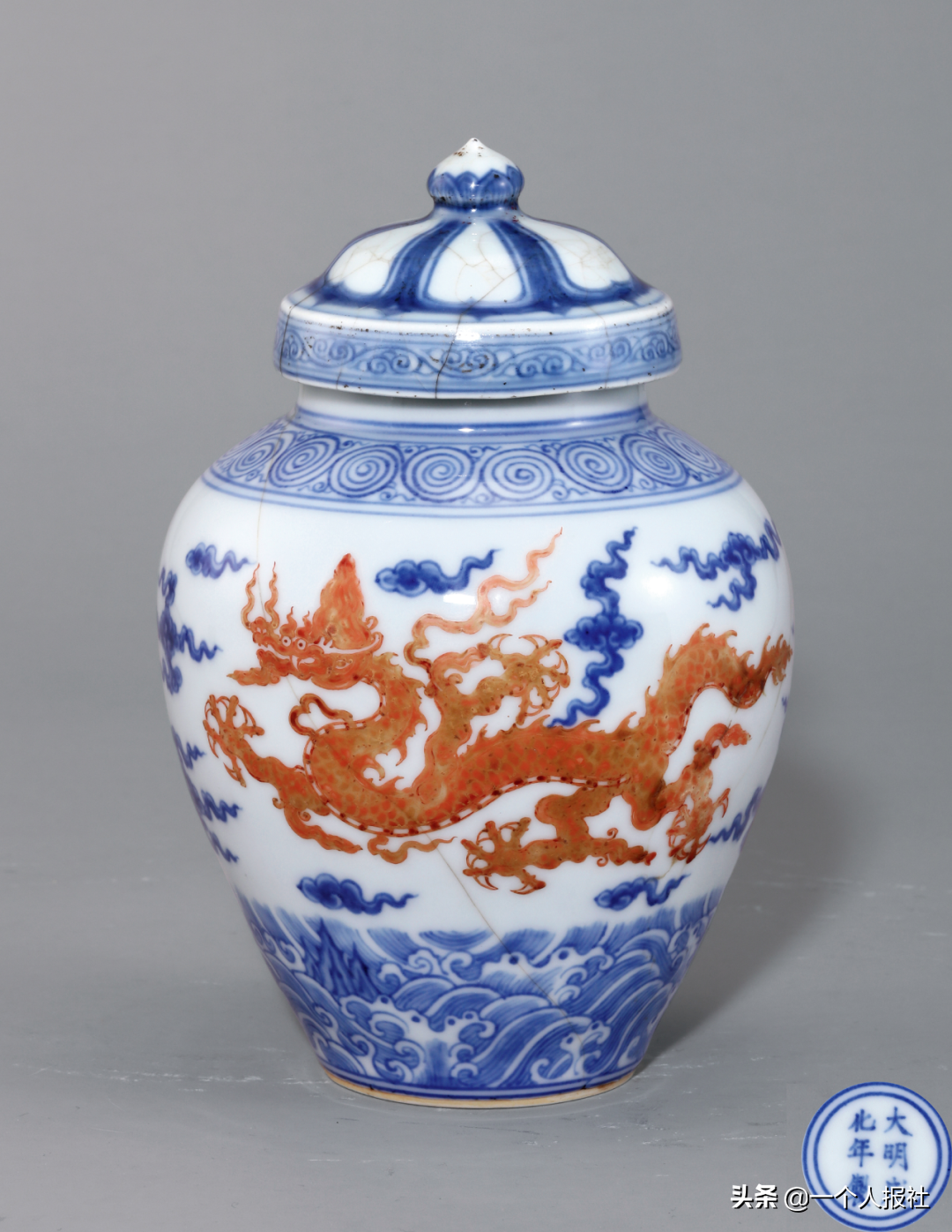 明成化青花海水江崖矾红彩龙凤纹盖罐