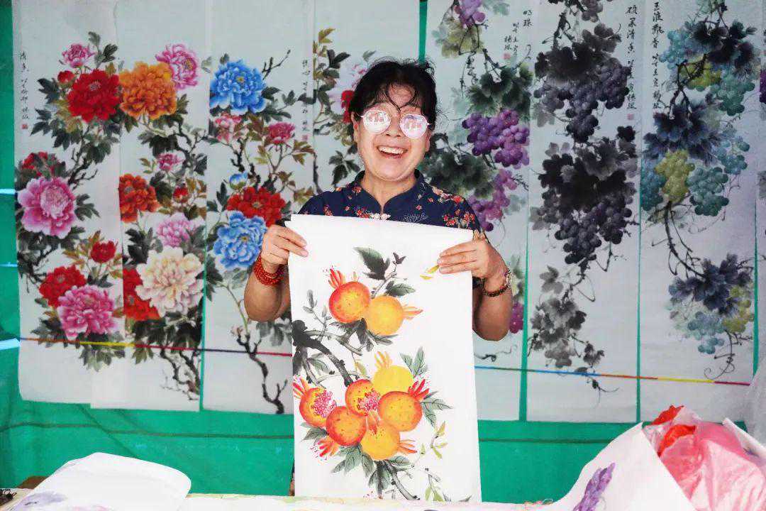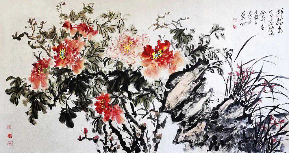 走进一位农民画家的画廊,令人耳目一新,左侧墙上一字排开四幅工笔山水彩屏,构图疏密相间,色彩浓淡相宜,意境清新淡雅,古朴深远,实力不凡。凑近一看,原来是绢画。绢画下方立着两幅未完成的画作,一幅才勾出草图,另一幅已开始上色。对面墙上却是写意花鸟的天下,只见秋菊腊梅各呈异彩,墨竹丛中鸟雀和鸣,而画廊主人正埋头他的装裱活。绘画装裱绝技在身,店主伙计融为一体,耳濡目染,使你不能不对这位进城的农民画家肃然起敬!闻说梁俊川的牡丹红了通渭城,耳听为虚,眼见为实。一步迈进画廊,满墙春色姹紫嫣红,争奇斗艳,直教人心旷神怡,满目生辉。而田园出身的主人此刻正双眸含情,伏案挥毫。试问书画之乡,动人春色有几多?去看俊川画廊"春色满园关不住!"