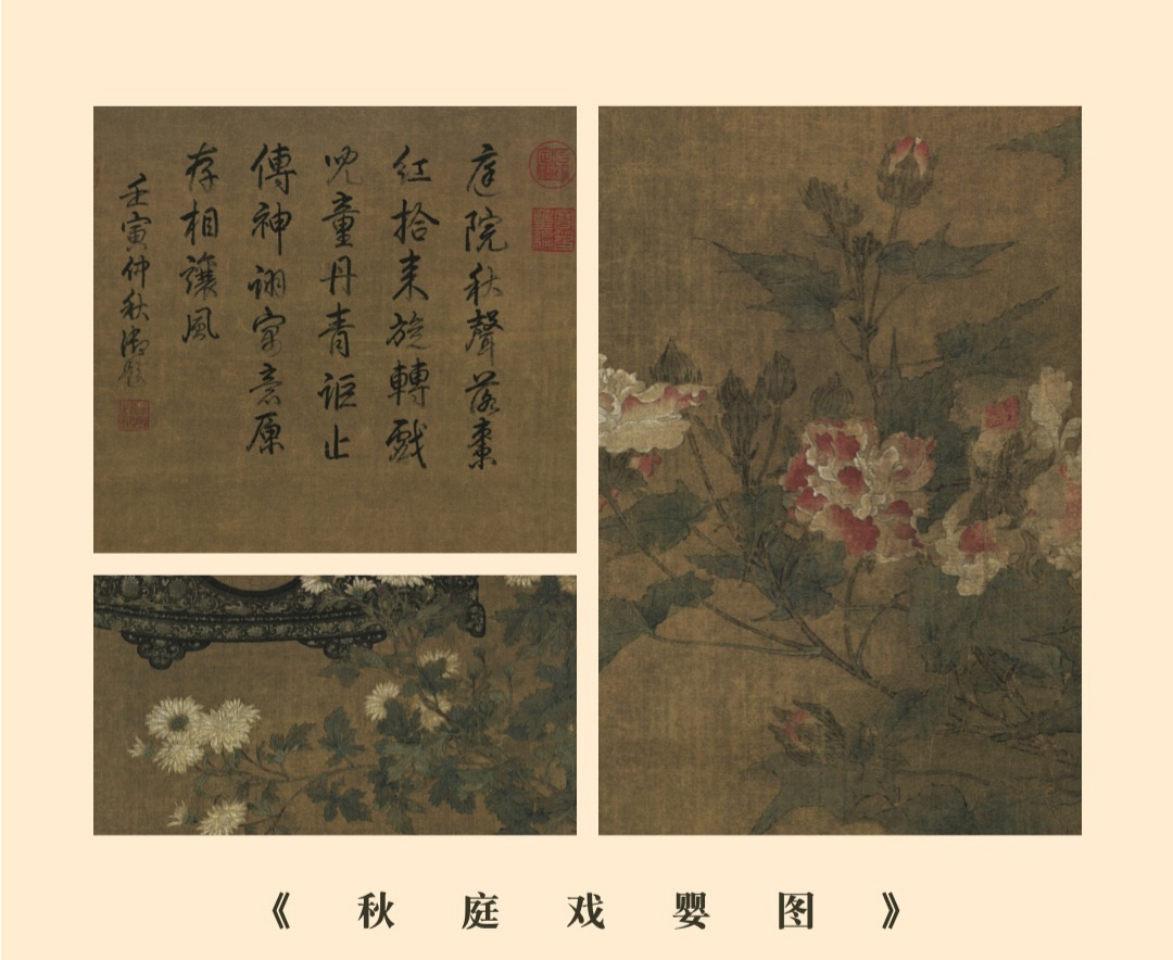 关于这幅《秋庭婴戏》的画面内容,今人陈葆真《古代画人谈略》一书有着精彩的描述:“画面偏右湖石耸立,把画面分成左右两半。右半面为芙蓉艳放,稚菊吐芳,暗示秋天。下方圆漆櫈上摆满精巧的玩具,地上铙钹一俯一仰,似乎已经失去主人关心。画面重点放在左下方的两个孩童身上。只是稚童二人,一衣白,一着红,正头挨头,弯身倚在描画的圆形漆櫈上推枣磨为戏。红衣男孩似乎占了上风,退去背上衣领的束缚,紧张又得意地正要下手。白衣女孩张开小小的嘴,露出一排细细的乳齿,伸手若有所辩。他们那样全神凝注,眼神交并,集中在桌面上那个小小的世界中,忘记了一切!”