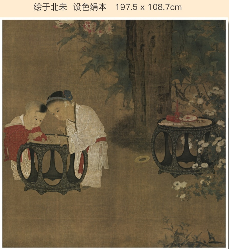 在宋代以后,婴戏图走向了成熟,并出现了大量以以儿时玩乐情景为题材的作品而苏汉臣所绘的《秋庭戏婴图》便是这类题材作品中的佼佼者。