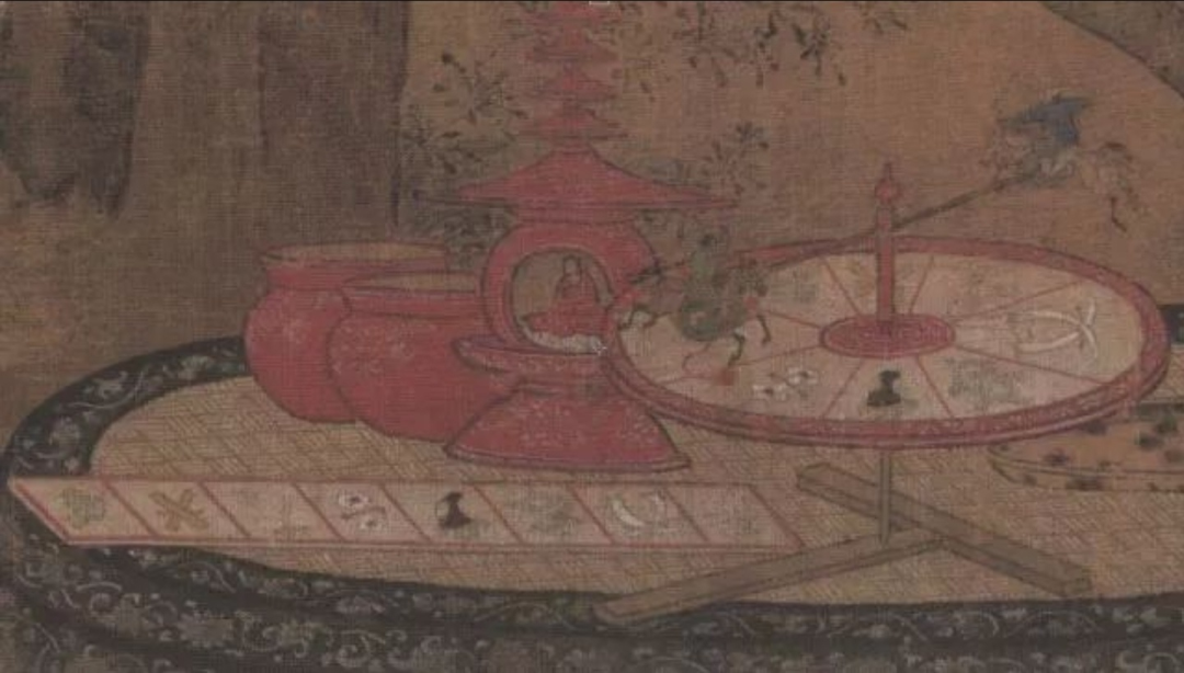 扬之水先生推测周密《武林旧事》所列举“儿戏之物”中的“轮盘儿”即是此物,并推测《秋庭婴戏图》中轮盘儿玩具的游戏规则:“快拨轮盘使之旋转,待其停止,视横竿一端的小人落在某格,便可获取某格中的物事,亦即小板上面放着的小物件。”此说尚有值得商榷之处。