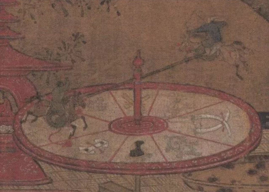 轮盘中央复耸出一柱,柱中横贯一竿,竿之两端各安一骑马小人,其中穿蓝袍者作骑射状。轮盘上画八条半径线作八等分,每等分中各绘一物事。