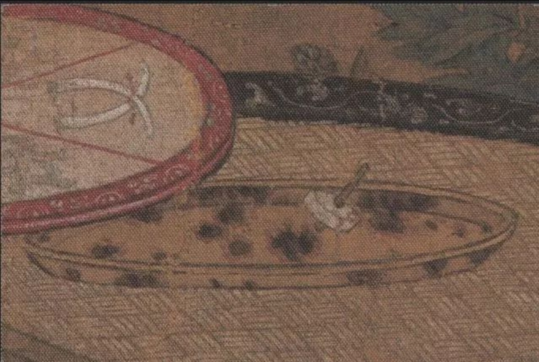 轮盘儿右侧玳瑁盘中盛一带捻陀罗。扬之水先生认为此即《武林旧事》中记载的“千千车”。清人翟灏在《通俗编》中认为“千千车”即是陀罗之类:“妆域者,形圆圜如壁,径四寸,以象牙为之,当背中央凸处置铁针,仅乃寸,界以局,手旋之,使针卓立,转如轮也。复以袖拂,则久久不能停,输局者有罚。相传为前代宫人角胜之戏,如宋人所谓千千也,此皆陀罗之类。”