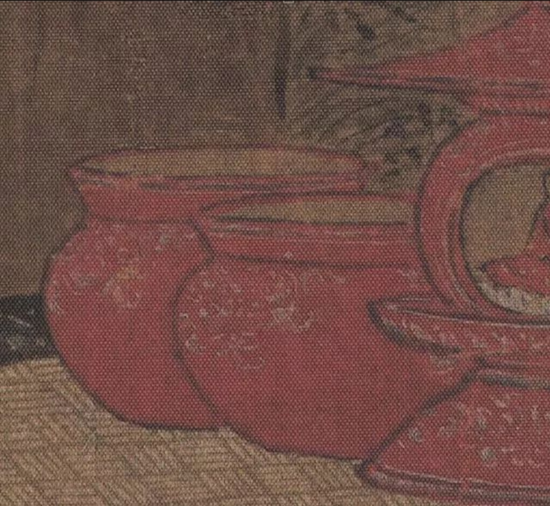 男孩则身穿红色金纹对襟罩衫,下身为白色印花裤,头发是孩童时期常见的样式,有着吉祥、阿福的寓意。他们围立在华丽的花凳旁,聚精会神的拨弄着“枣磨”这种玩具,是宋代时期流行的游戏,孩子们将两颗枣子分别插在一根竹棒的两端,又用三根竹签支起另一个被削掉一半,漏出枣核的枣子。他们将竹棒横立在枣核之上,比谁能将其转动更长时间。