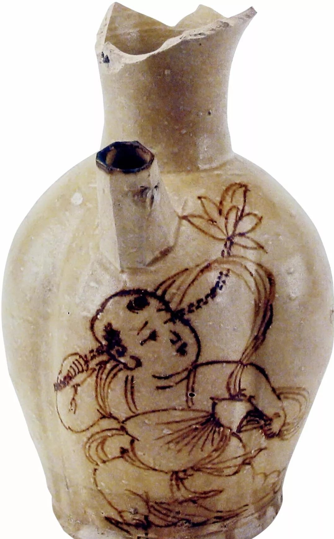 根据现已公布的资料可知,长沙窑的人物图不多见,大概不足10例,均以釉下褐彩或釉下褐绿彩绘于青釉瓷器之上。最为著名的就是莲花童子图。