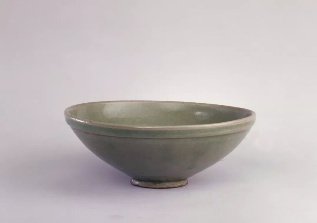 碗敞口,宽唇,圈足。里外施青釉。碗内刻婴戏莲花纹饰,一肥胖的婴儿戏于三朵莲花之间,两手腕各戴一手镯,憨态可掬。此碗刻花精细,画面生动活泼。北宋晚期,耀州窑装饰多取婴戏纹题材,此类构图还有两婴荡秋千、四婴戏把莲等。