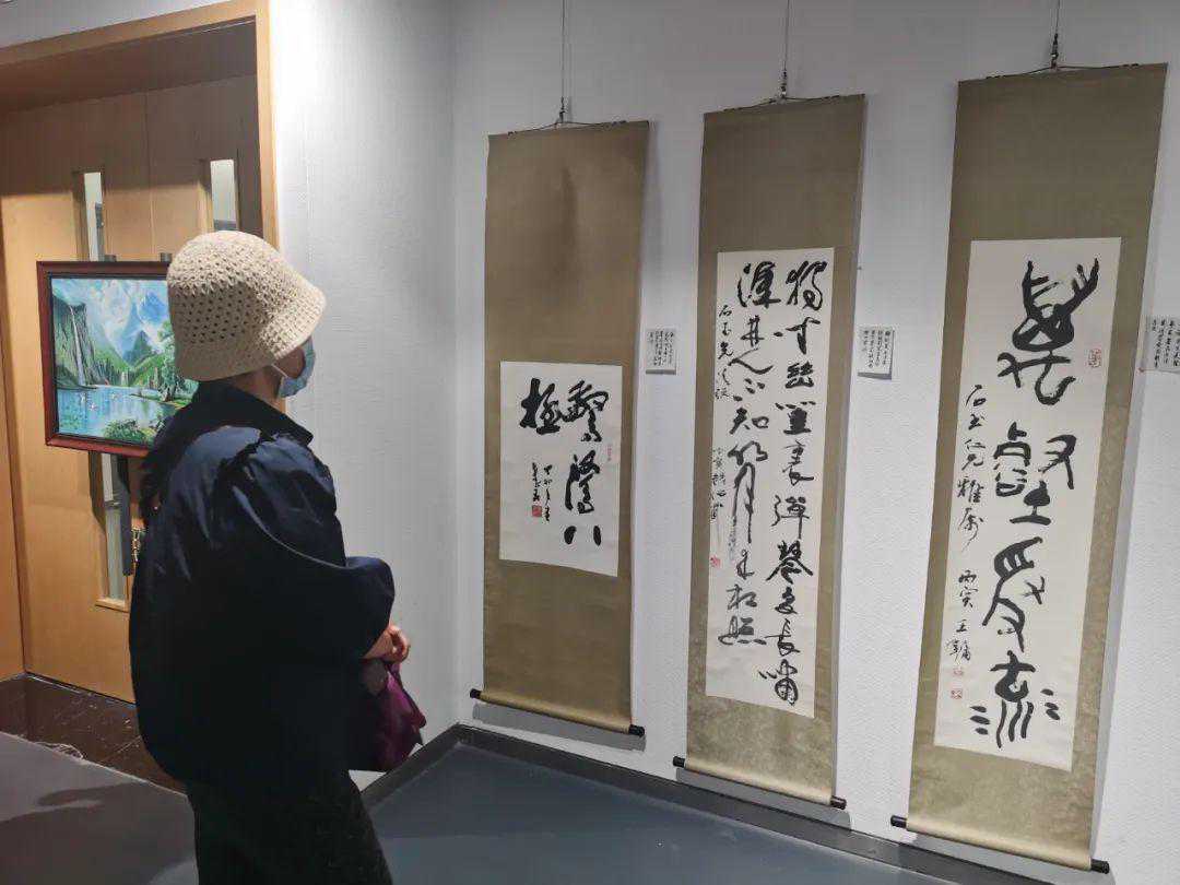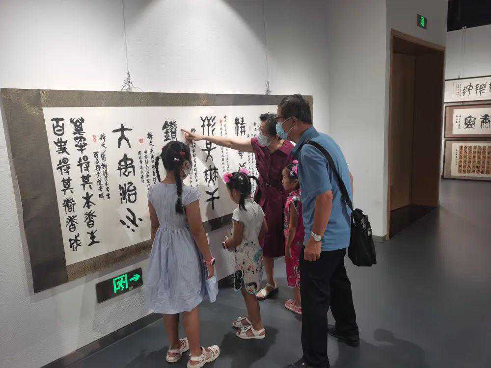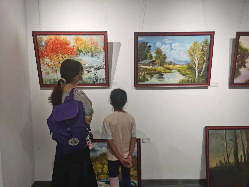 联展开放期间,展厅各处皆有居民静静欣赏作品,不少居民还领着自家孩子一起感受书法、油画带来的文化熏陶。“没想到身边有这么多热爱书画的邻居们,正巧离家不远,就带着儿子来看展览了,他对书法有了全新的认识,我准备培养他这方面的兴趣。”居民李女士表示。