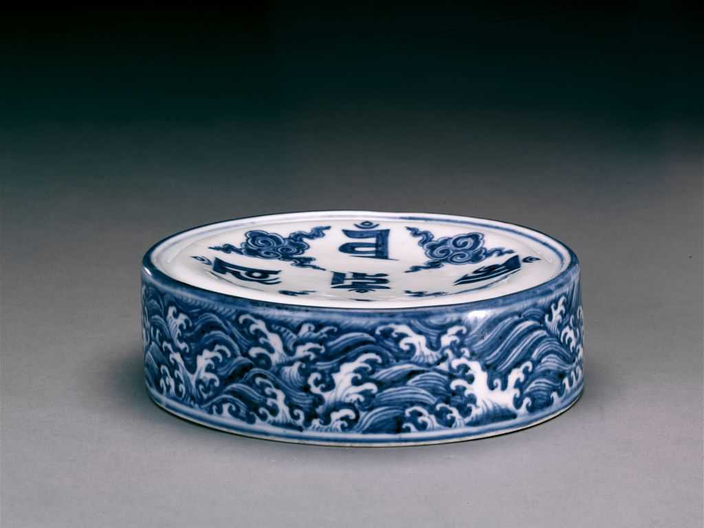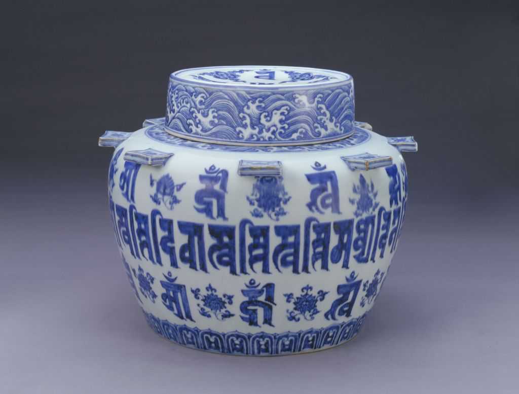 盖内9字中,有5字为五方佛中的五佛种子字,另4字分别代表前四佛双身像中的四女像种子字。罐外壁中间一周梵文为密咒真言,其上下各有8个相同的梵文,代表各方佛双身像中的女像种子字。此种文字组合图案被密宗信徒称为“法曼荼罗”。此器在宣德青花瓷中极为少见,其造型、花纹均充满宗教含义,当为佛教徒作道场时所用的法器,是景德镇专为宫廷烧制的佛事用具。