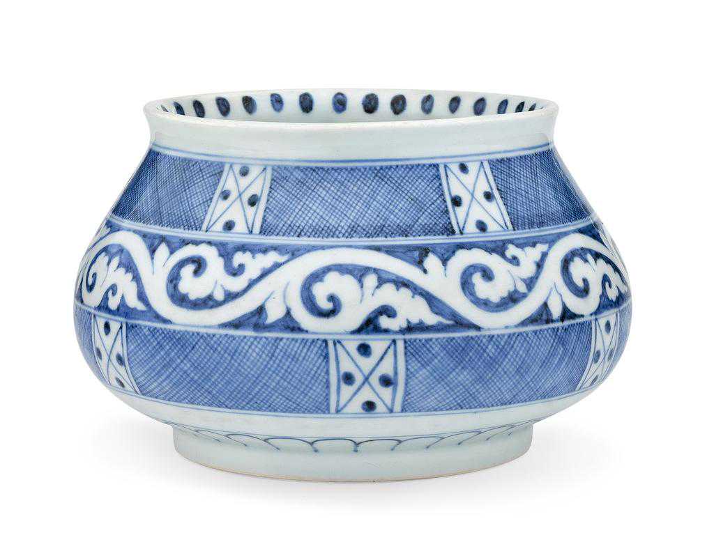 尊广口,扁圆腹,圈足。通体绘青花纹饰,颈部绘蕉叶纹,腹部绘海水波涛,海水上为如意云头纹。足底青花双圈内有青花楷书“大明宣德年制”六字款。蕉叶与海水纹是宣德青花瓷器上的常见纹饰。此器纹饰以写实与图案化布局相结合,自然而和谐。
