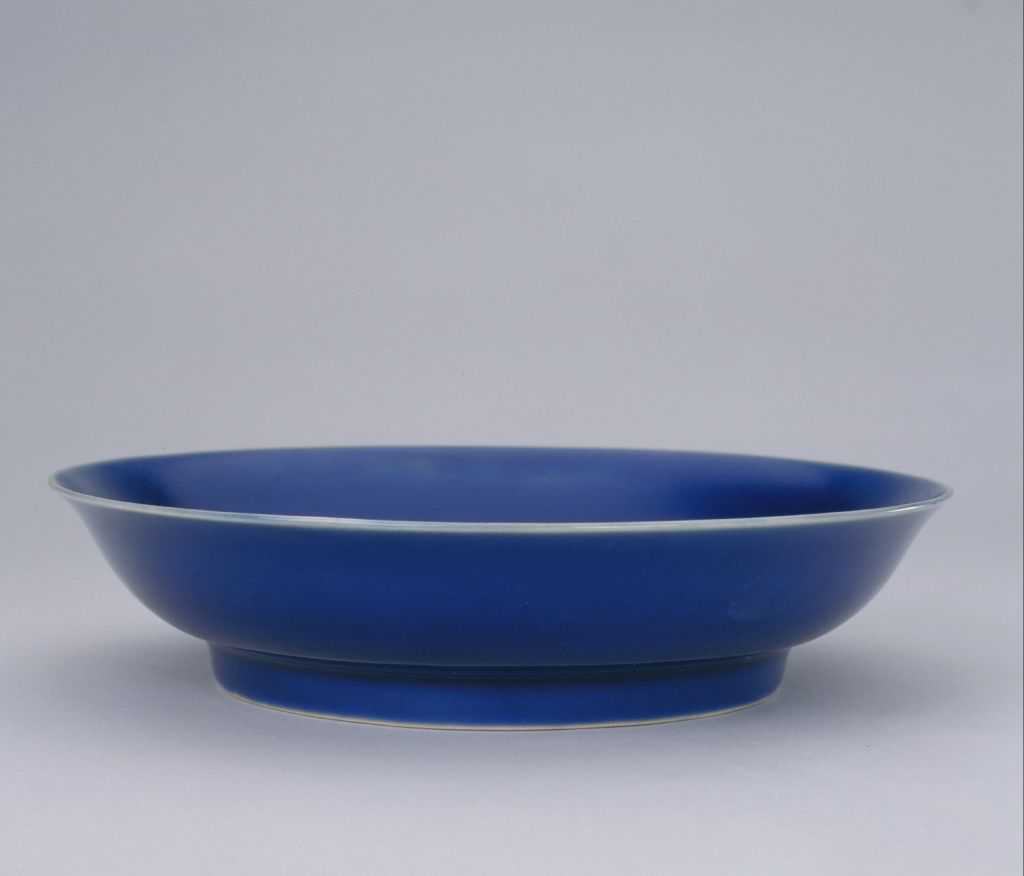 盘撇口,弧壁,圈足。通体施高温钴蓝釉,口沿处因高温下釉层熔融垂流映现白色骨胎,形成一道圆润的白边。釉面泛橘皮纹。内壁暗印双云龙戏珠纹,因釉层厚,纹饰不清晰。足内施白釉,中央青花双圈内“大明宣德年制”六字双行楷书款。此盘造型规整,釉色纯正,是宣德朝祭蓝釉瓷的典型器。
