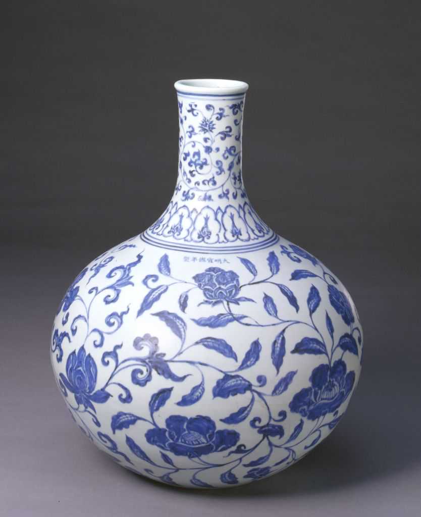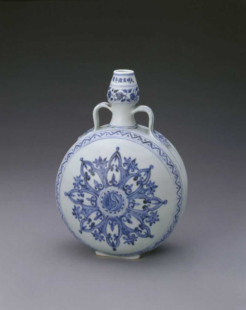此葫芦扁壶为明永乐时景德镇御窑厂的创新器形,宣德朝继续烧造,品种有白釉、青花等,造型与纹饰皆仿自西亚伊斯兰工艺品。明永乐朝制品不署年款,宣德制品一般则署年款。