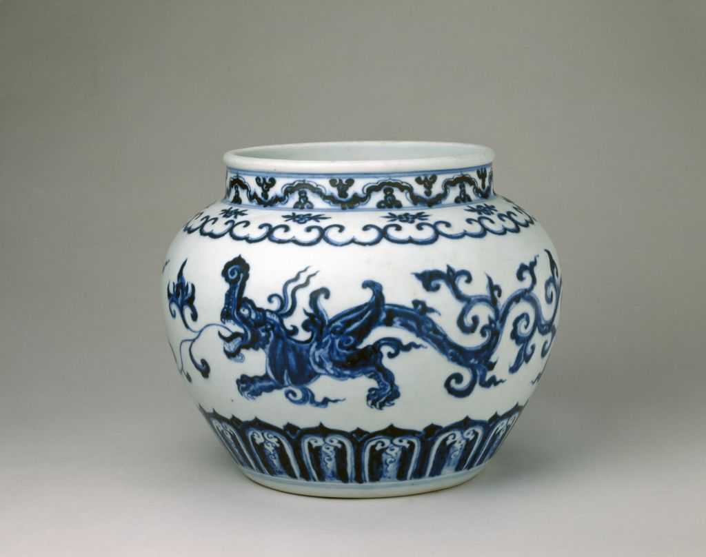 宣德青花图案以线条流畅、纹饰豪放生动著称。夔龙纹样用于青花瓷始于宣德朝,至成化时已成为瓷器上的典型图案,后世亦多延用。宣德时所用青料据明万历时王世懋《窥天外乘》和黄一正《事物绀珠》中所记为“苏麻离青”,这种青料含铁量高,含锰量低,在适度的窑炉气氛下烧成后能呈现宝石蓝般鲜艳的色泽,但由于含铁量高,在青花色彩上常自然形成不均匀的黑色结晶斑点,与艳丽的蓝色相互映衬,更增其艺术魅力。此罐之青花色泽即具有这一时代特征。