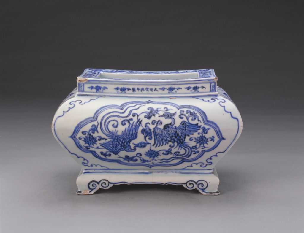 此炉形制奇特,方口出唇,扁腹,下承四如意折角足。通体青花纹饰。口沿饰缠枝灵芝纹,颈饰小朵花纹,腹部菱形开光内绘双凤穿莲花纹,腹、足四角各饰如意云头纹。口沿下从右向左署青花楷体“大明宣德年制”六字一行款。