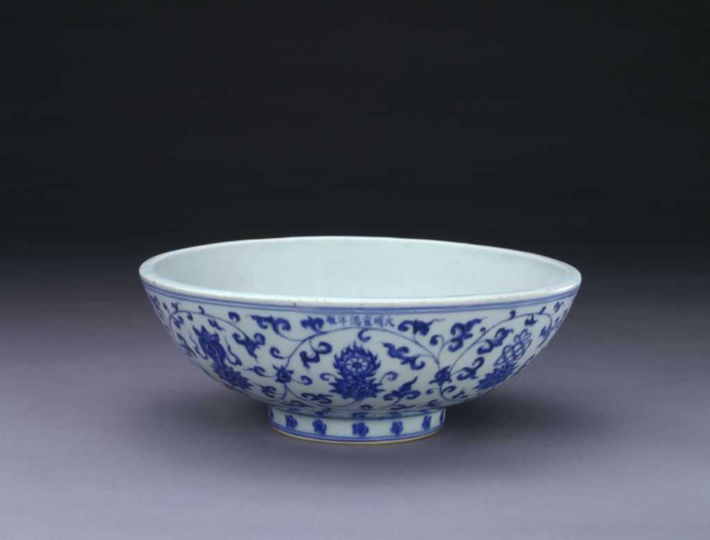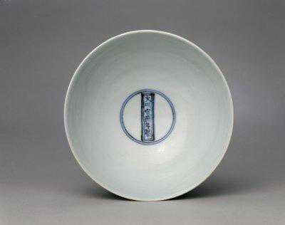 宣德瓷器人物纹较少,所见者均文人士大夫的气息浓厚。此器纹饰绘仕女赏画情景,表现着一种恬静淡漠的格调。里心有青花楷书款,是典型的宫廷御用器。