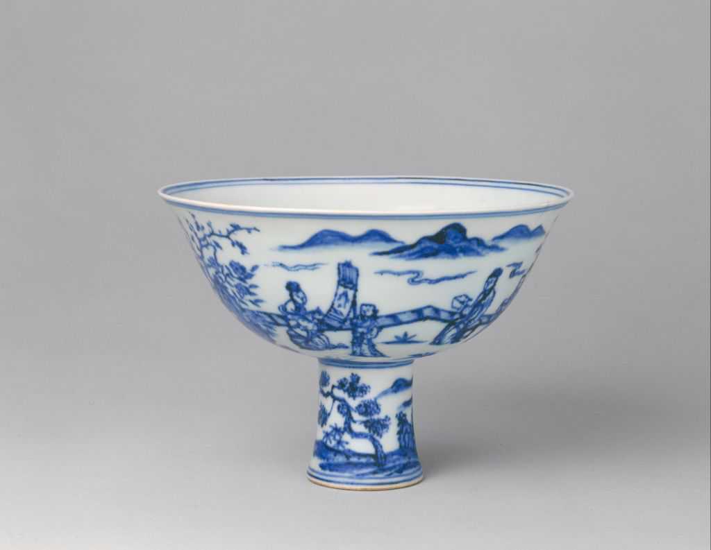 青花庭院仕女图高足碗