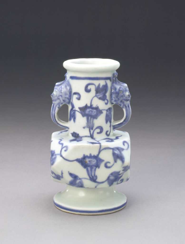 此瓶造型系模仿西亚伊斯兰国家金属器。瓶腹委角处过度自然。器足内呈台阶式,这种将外撇形高圈足的内部作成台阶式成为宣德时期的一个特征。牵牛花是宣德时期常用的纹饰。画笔自然生动,缠绕的藤蔓、盛开的花朵,将牵牛花的花、叶、蔓表现得活灵活现,别有新意。在青花料的使用方面,此瓶使用的是国产与进口的混合料,青花晕散自然,并有下沉的氧化铁结晶斑。此种委角瓶在明晚期和清雍正时多有仿制。