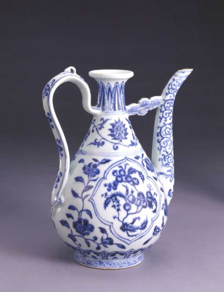 青花三果纹执壶此壶造型端庄古朴,釉质肥厚莹润,青花色泽深沉含蓄,色重处青花下凹,呈现出点点的黑疵斑痕,与浓艳的青色相映成趣,形成独特的艺术效果。宣德时期使用进口的“苏泥勃青”料,烧成后的青花色泽浓重艳丽,深入胎骨,为宣德青花的显著特征。