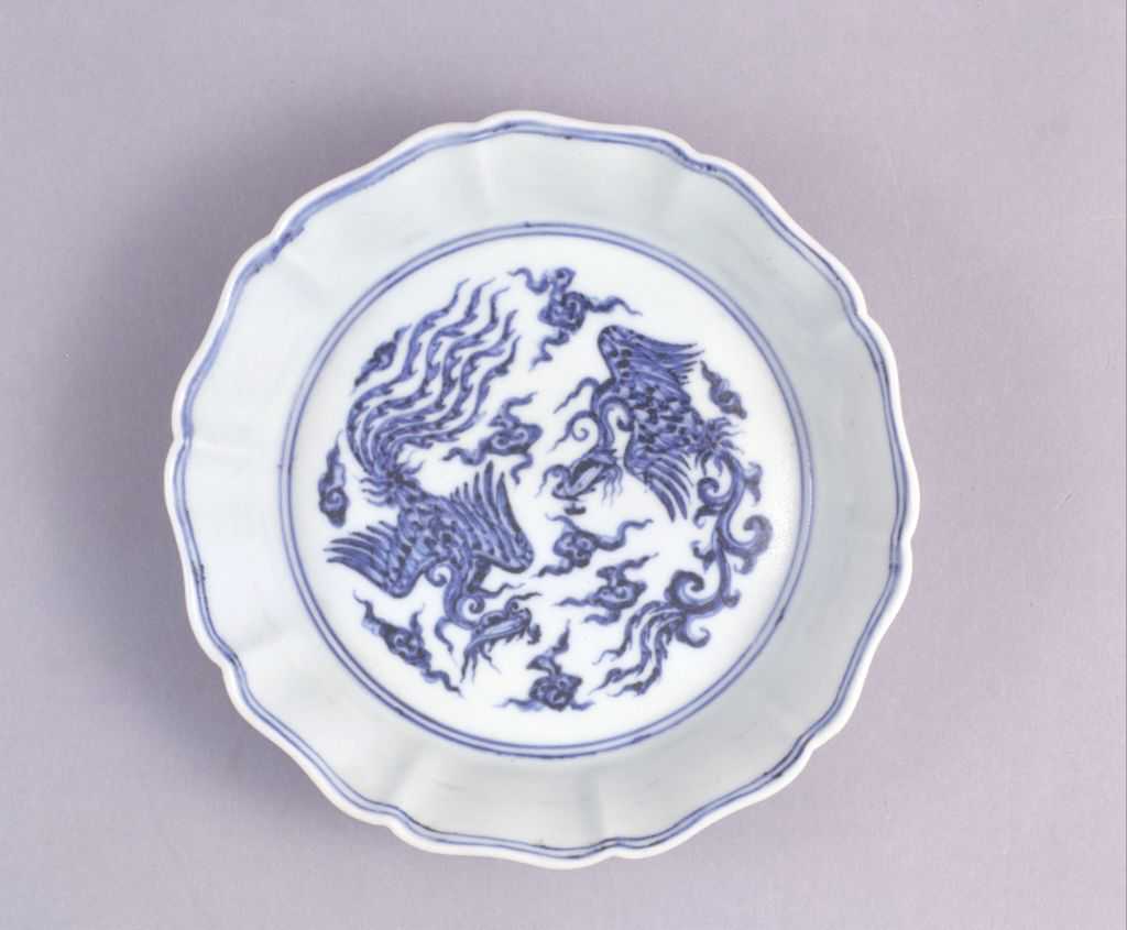 青花鸾凤纹葵瓣式洗洗呈五葵瓣形,里心微凸起。通体青花装饰。口沿内外饰青花双线纹,里心绘凤、凰各一只,间以朵云。外壁绘团形凤凰10组,与葵瓣式器身相对应。底青花双圈内有“大明宣德年制”六字双行楷书款。此器造型别致,釉质莹润,青花色调浓艳,工艺技法娴熟。