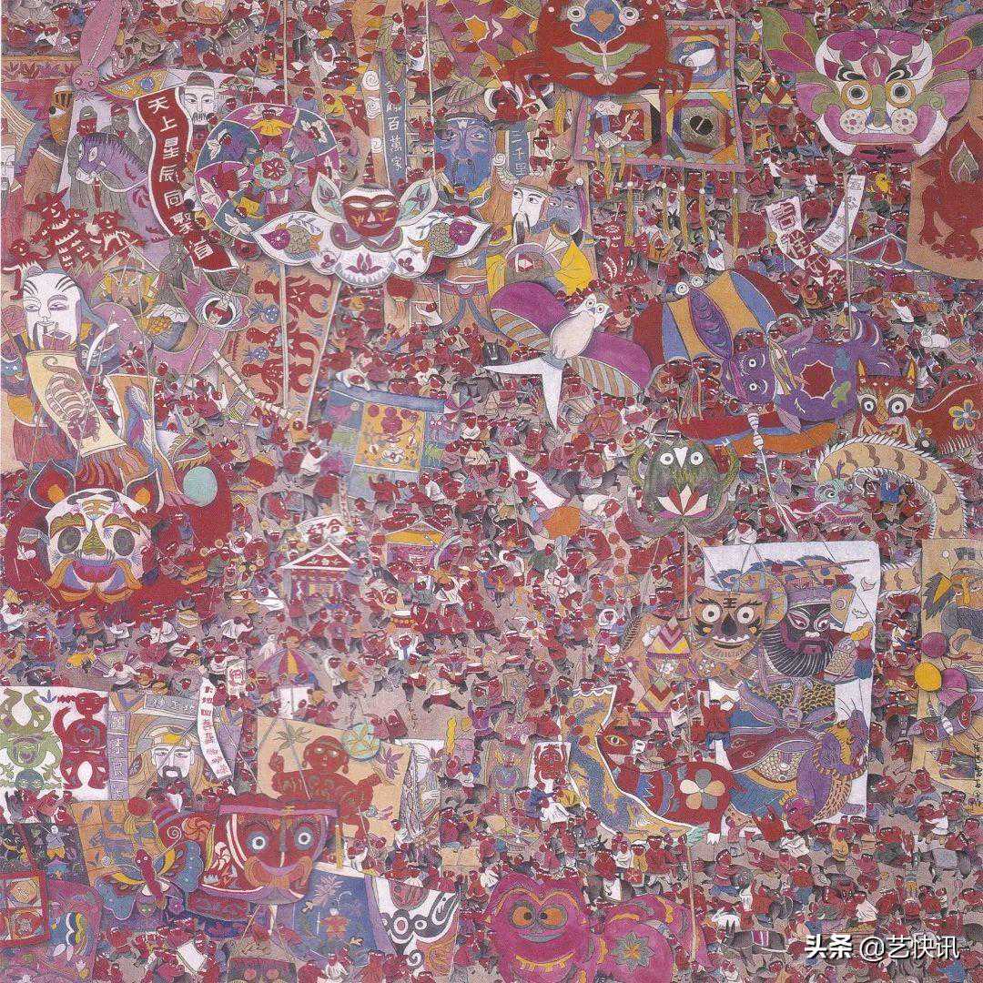 他极力寻找自己的语言,选择“小人点”作为精神意向的载体,散布于画面的每一方寸,构图充盈,色彩跳跃。它说不上某宗某派,却以视觉上的强烈刺激把人带入与作者同样的迷狂状态……