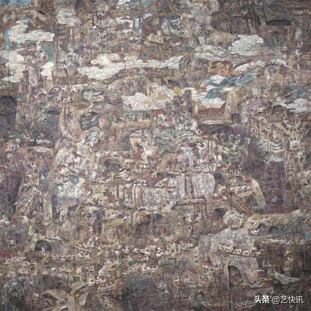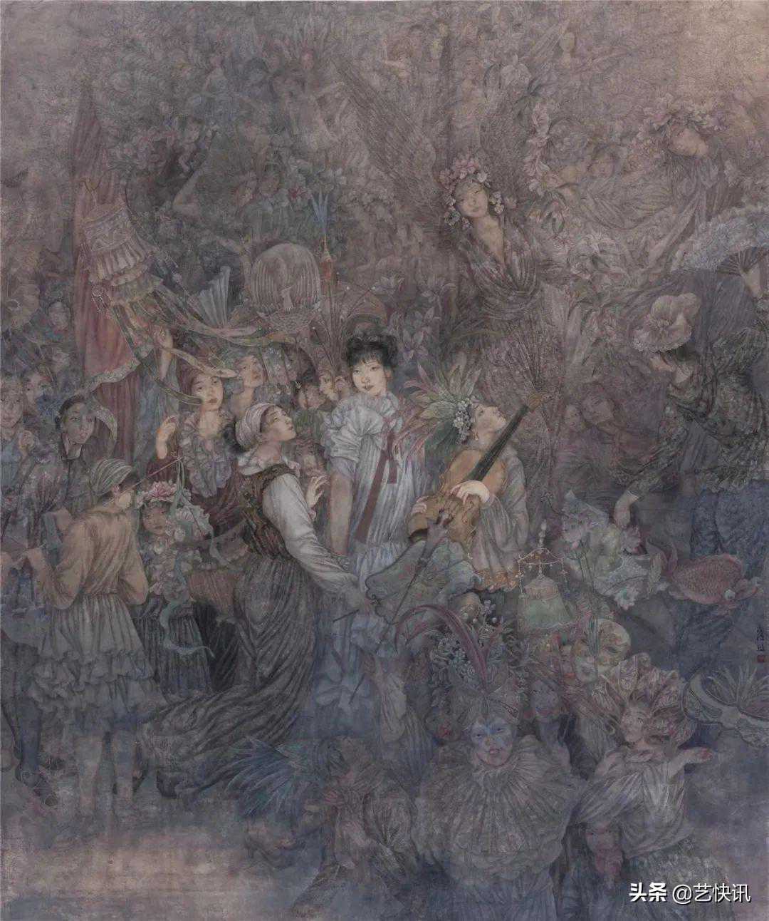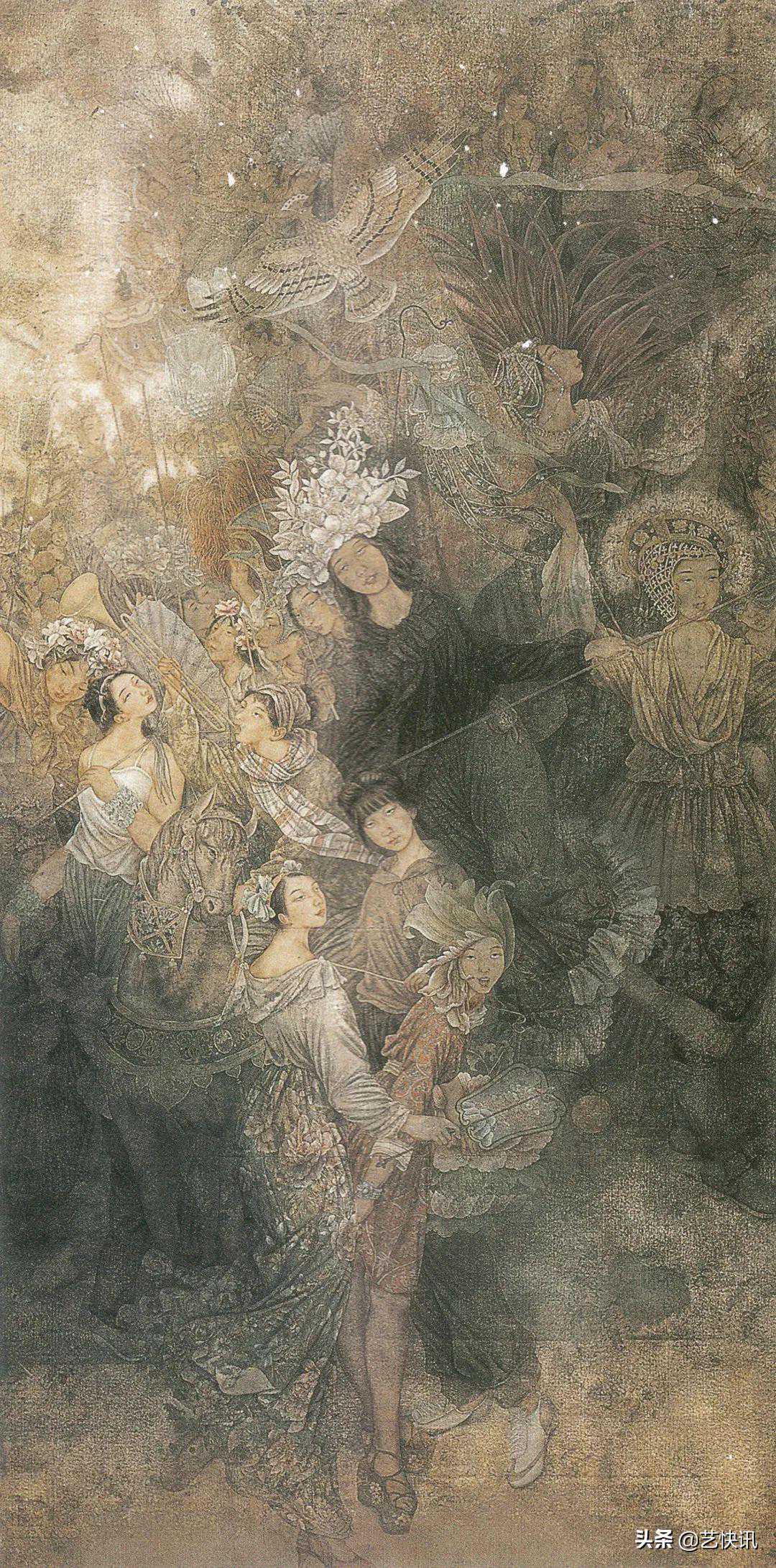 在《欢乐今宵》中遨游天际的祥云瑞鸟、奇花珍禽与优雅静穆的少女、缓步行进的仪仗队伍、纵横驰骋的戏剧人物共同营造着一种富于历史底蕴和东方格调的“欢乐”。由于在人物形象、色调敷染和空间节奏处理上直接吸收了六朝《洛神赋图卷》和佛教经变图的象征手法和图式,更增加了画面神话般的叙事特征,它反映了人的欢乐本性在一种历史和美学沉思中所获得的那种超越性自由,在历史隐喻中寻找到与我们生存现实相关的视觉意义。