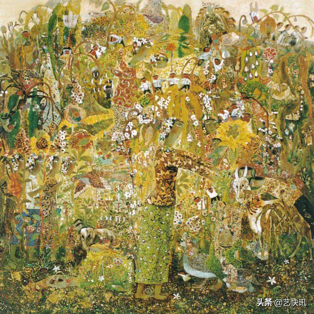 没有空间,没有时间,没有属性,没有性别,层层叠叠的形象,充塞着童话般的梦,人与禽也可喃喃细语,梦幻般的乐土溶于特殊的画面形式之中,这便是崔进的世界。