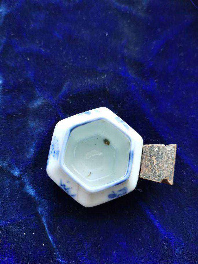 该器瓷质坚致,洁白细腻。小巧玲珑,装在鸟笼上,一定打眼。可惜的是,几十年过去了,已经有了一道“冲”。现在只能看“画片”了。