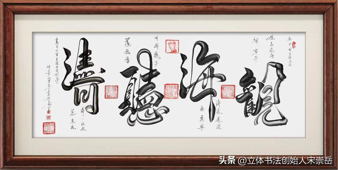 书法讲究传承,所以需要师益古风。书法同时需要创新,所以需要天才之功。他的书法源承碑帖,高古正泰为根本,同时又依个人才华的丰劲,在书法创新的道路上走得特别卓越。他依对水墨调和的娴熟,执毫先蘸饱墨,然后毫尖入水,让水墨在笔毫上形成刻画立体线条的融合关系,然后意在笔先,富有奇谋,执笔入纸写纷飞,奇观线条显浓淡,水注中锋,墨融双侧,书法线条有了明暗深淡的对比关系,笔走龙蛇,却绝不浑糊,一气呵成,终见立体成奇观!从而创造出奇绝于当代的立体书法!奇观自有奇誉,2013年在全国政协大礼堂挥笔巨制,写下巨幅毛泽东诗词一幅书法,书配文章,顶天立地,豪爽英姿,毛泽东女儿李纳面对磅礴笔墨,给予高度评价。他的书法作品不但走进了政界殿堂,被烧制成红瓷珍品,成为国礼大品,在对外文化交流过程上拔立功勋,又有为数众多的书法珍品进入到了艺术品收藏界,成为大贵金质的艺术珍品。