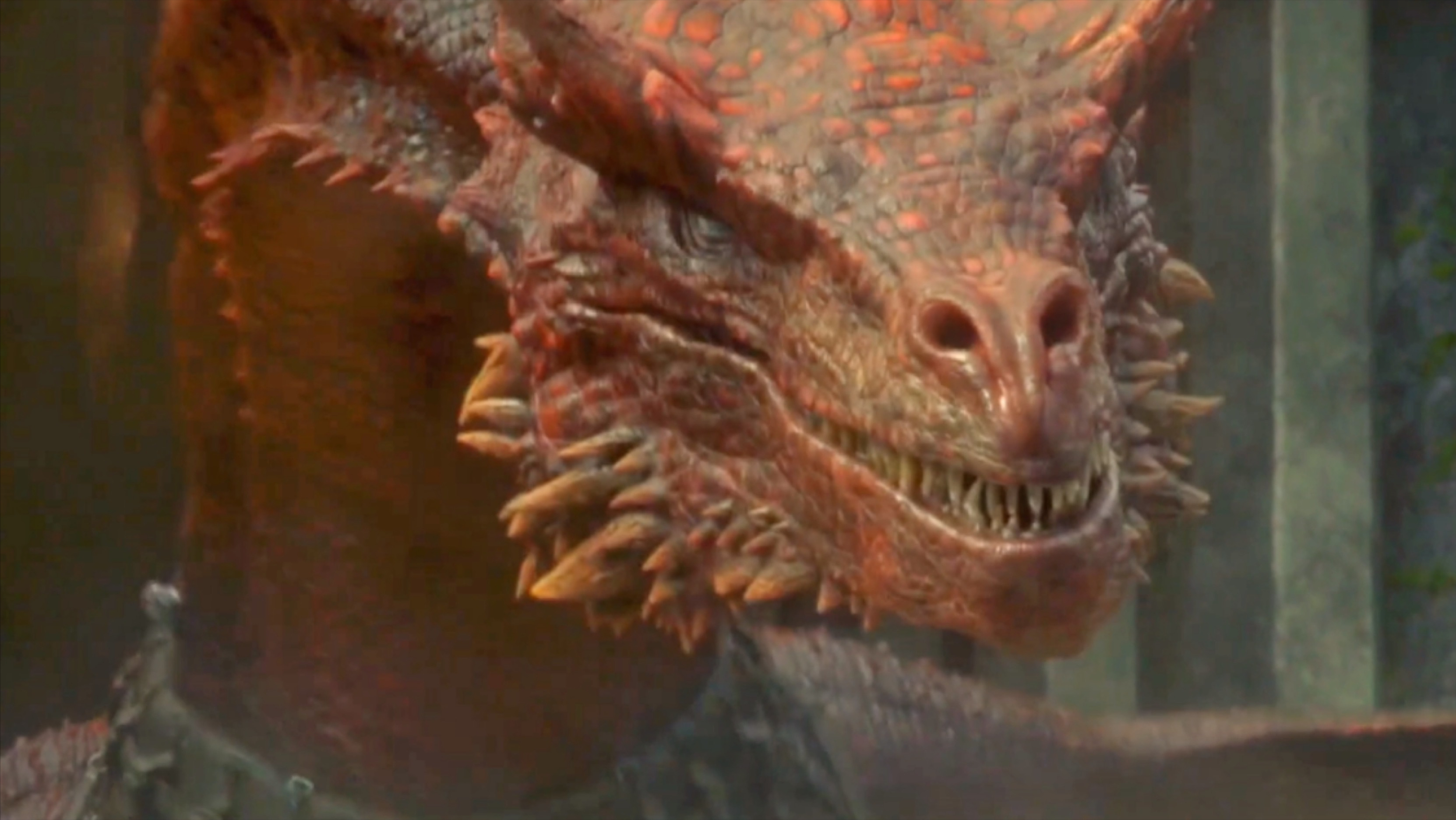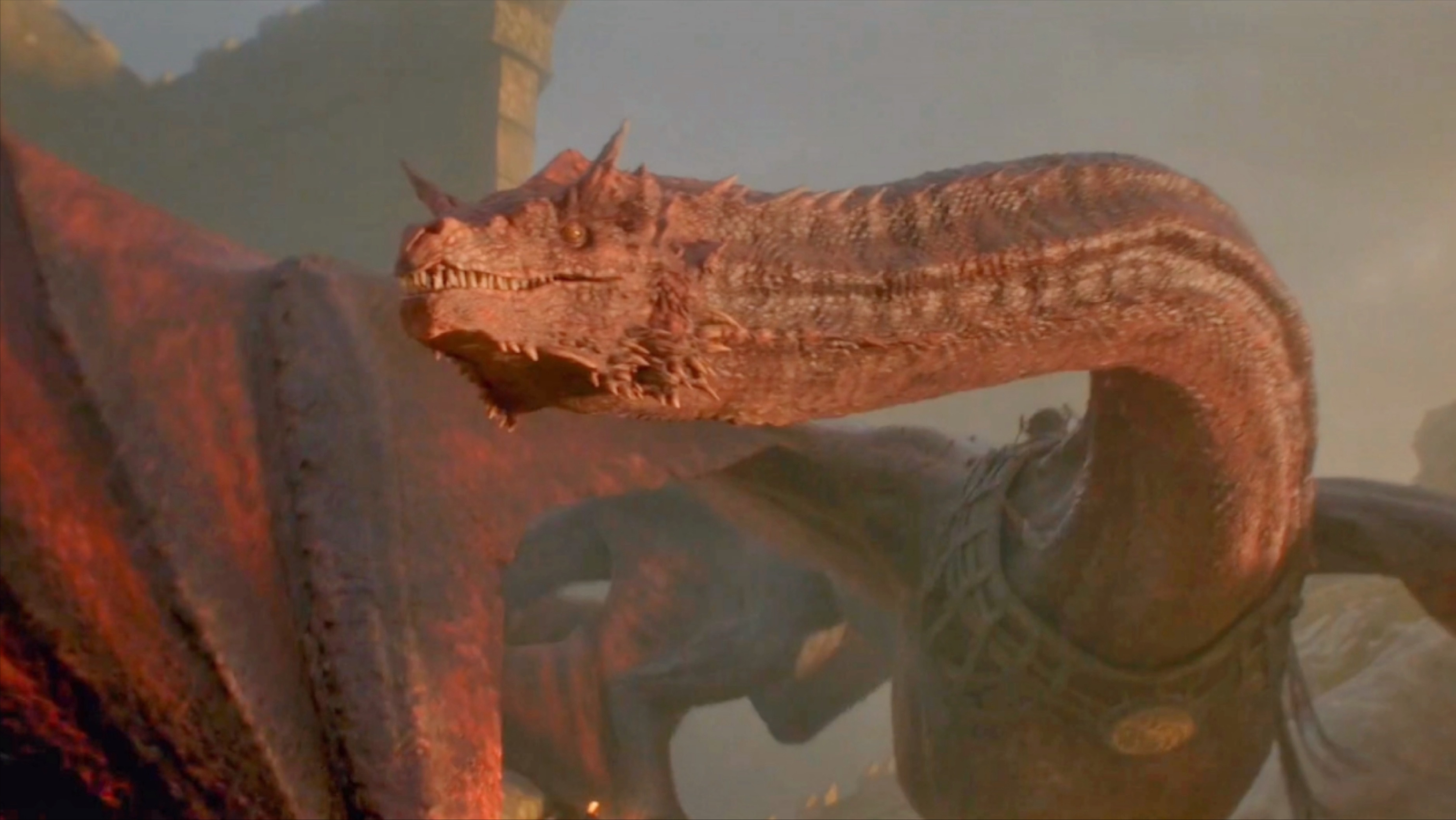这条活了180岁的巨龙瓦格哈尔,可以称之为坦格利安家族的三大始祖龙.在征服前的52年,于龙石岛上用龙蛋孵化出来,到了龙之家族的时间线,它成了现存最大以及最年长的飞龙。它站在地上比城墙都要高,喉咙大到可以吞下一匹战马,仅仅只比它的大哥,史上最大的龙贝勒里恩小一点点。龙之家族第1集出现的硕大龙骨就是贝勒里恩,也被称之为黑死神,据说它的体型大到可以吞下猛犸象,寿命达到了200年。