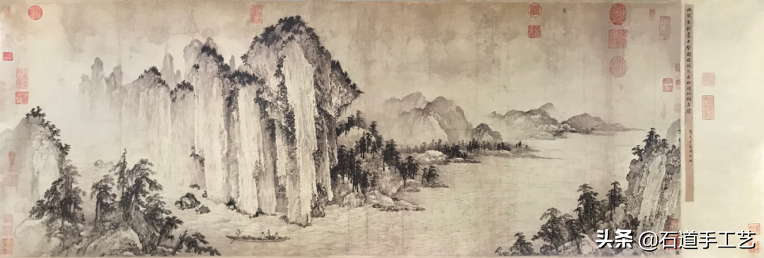 巨然(10世纪),江宁人。开元寺僧。南唐亡,随李后主(李煜)降宋。画师董源,得其正传。所画山水笔墨秀润,善为烟岚气象,对元末四大家影响颇大。这幅布局、用笔、用墨极精,为其杰作。