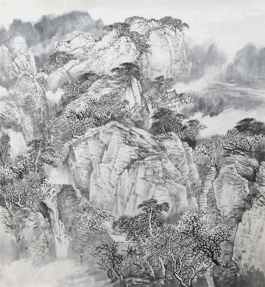 中国画的灵魂在于笔墨。唐代张彦远在《历代名画记》中说:“夫象物必在于形似,形似须全其骨气,骨气形似,皆本于立意而归乎用笔”,中国画极其推崇笔法,强调书写性,通过书写,写形状物,表情达意,传导出中国画的笔墨精神。赵舒春绘画笔法老到,如籀似藤,仔细观察其笔法,其勾勒山石、低丘、浅陵以墨为骨,力透纸背,重笔浓墨生发出蕴藉意蕴,有碑拓石雕之感,线条挺健,不事雕琢,块面清晰,有如版画简洁深刻,力感十足。赵舒春用线造型能力强,线描功底扎实,一幅画作往往用几条主导线条来经营位置,完成大的构图,线随型走,型以线定,再辅之以长短粗细线条,浓淡干湿用笔,快慢疾涩把控,比较主观和理性地突出了线条在画作中的功能作用。他喜用斧劈皴、折带皴,用线刚劲直硬,长枪大戟,不计工拙,起止走向,一任自然,线条似平铺直叙,又饶有韵味,似平行排叠,又富于变化。“枯笔取气,湿笔取韵”。他喜用渴笔、枯墨,用笔枯而能润,枯而不涩不滞,拿捏到位,有些线条纤细而不羸弱,干枯而不乏味,于不经意处见丰神,从漫不经心处见匠心。赵舒春画作中的树木多以白杨树为主,枝杈向上,挺拔高大,层层叠叠,林林总总,显示出顽强的生命力和昂扬向上的精气神,赋予白杨树一种精神寄托,有如茅盾《白杨礼赞》读后的热血沸腾与情感脉动。对白杨树的描摹,前人没有成熟的画法,赵舒春全凭自己的探索与创造,以反复散锋皴擦之法塑造树之外形与枝杈,以形写神,遗貌取神,形成了自己独特的笔墨语言。由于对线条的长期锤炼与打磨,使赵舒春的笔墨简洁爽直,清空精深,如蓄势蕴能的弓弩,又如万箭齐发的箭簇,爽爽有一种生气,郎朗有一股士气,这些质感十足的线条赋予了赵舒春画作大气磅礴的气象,元气淋漓的气格,铁骨铮铮的气质,因而,用苍健浑朴、遒劲沉凝来概括赵舒春的画风,就显得十分贴切。
