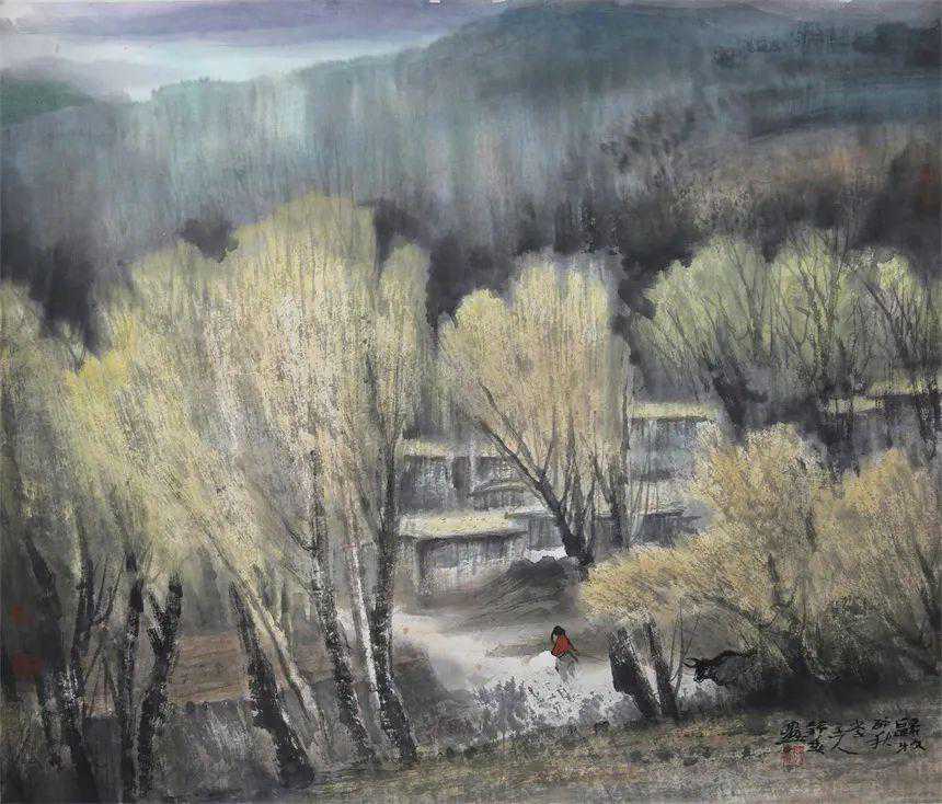 “日月盈昃”“寒来暑往”(《千字文》),辽西四季分明的景致,触发了赵舒春的创作灵感,扩充了他的创作素材,他纳四时于笔下,藏丘壑于胸中,将变化无穷的辽西风光悉表画端,把一个艺术化的辽西呈现在观者面前。春之万物萌发,如《辽西春色》《放泉》《西辽新绿》等;夏之清凉蓊郁,如《绿野》《山里红》《山岭人家》等;秋之天高地迥,如《家乡厚土》《山抹秋霞》《闾北秋韵》《秋原》《秋艳》《秋声》等;冬之素洁静雅,如《素染家山》《西辽春雪》等,俱是他采风写生,善于观察,删繁就简,去粗取精的精心之作,也是他不落窠臼,勇于探索,锤炼技法,表达性情的倾心之作。